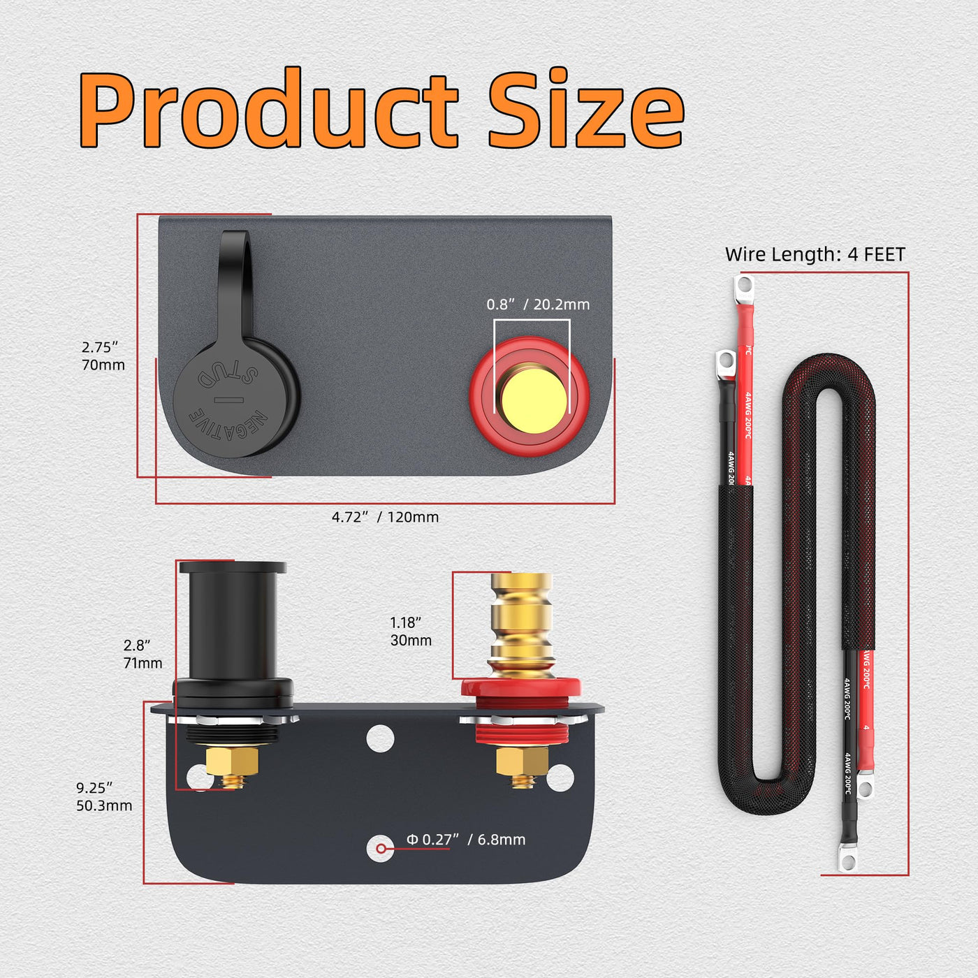 ? Product ? - A pair of battery charger post with with Heavy Duty Mounting Bracket and protect covers. ? 3/8'' Stud Terminal ? - The remote battery terminal is 3/8'' stud terminal design, which makes it become suitable for larger size terminal connectors and wires. ? Different Color Cap ? - The battery charging terminals will come with two different color caps, which helps to distinguish poles after installation. ? Safe & Easy to Use ? - The cover of the battery jump post can shelter the exposed contact, prevent dust and water, as well as prevent some accidental contact when not use. ? Application ? - The car charging post is suitable for automotive, car, truck, marine, boat, ATV, can-am etc.