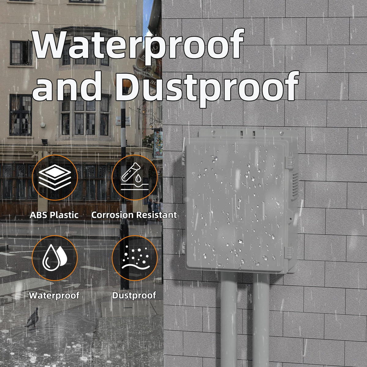 Q: Is this electrical box waterproof and dustproof?A: Yes, the Joinfworld Outdoor Electrical Box is designed to be waterproof and dustproof, featuring 2 non-slip buckles and a built-in dust screen to effectively prevent water and dust from entering.