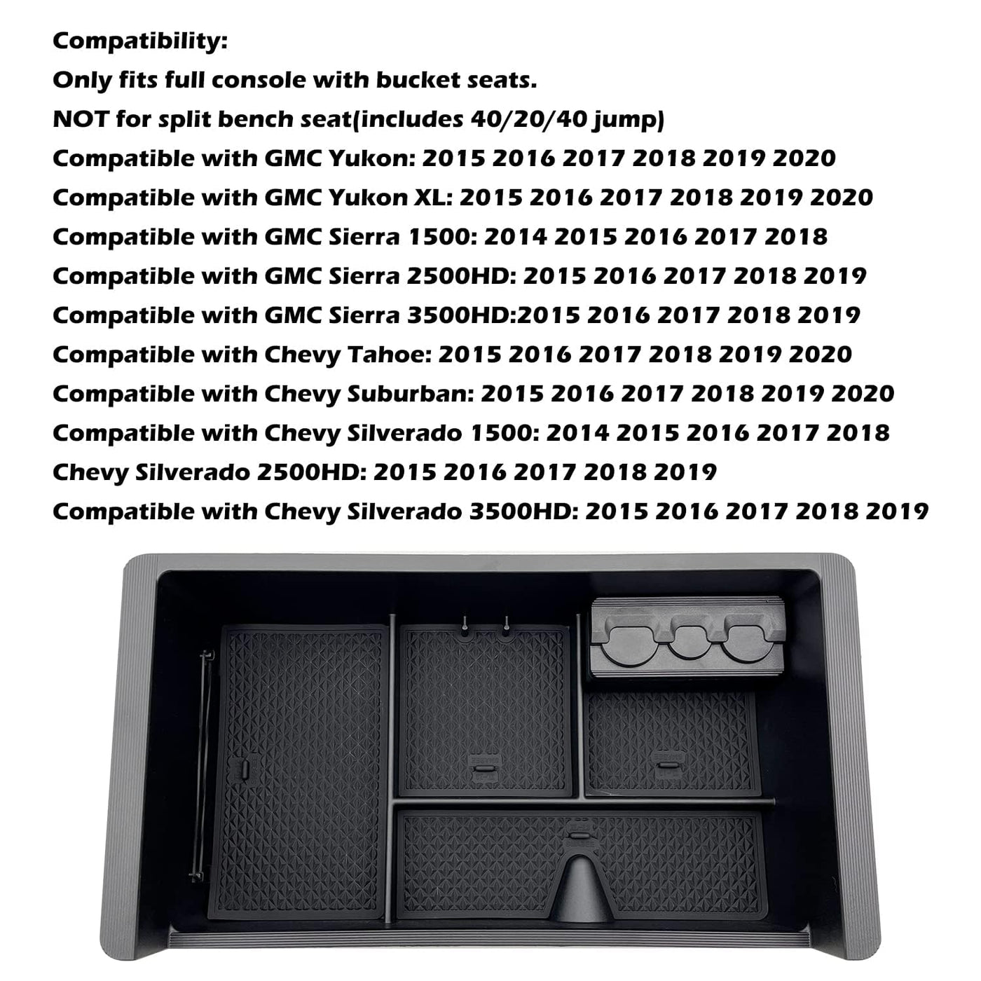 Compatibility: Only fits full console with bucket seats. NOT for split bench seat(includes 40/20/40 jump) Compatible with GMC Yukon: 2015 2016 2017 2018 2019 2020 Compatible with GMC Yukon XL: 2015 2016 2017 2018 2019 2020 Compatible with GMC Sierra 1500: 2014 2015 2016 2017 2018 Compatible with GMC Sierra 2500HD: 2015 2016 2017 2018 2019 Compatible with GMC Sierra 3500HD:2015 2016 2017 2018 2019 Compatible with Chevy Tahoe: 2015 2016 2017 2018 2019 2020 Compatible with Chevy Suburban: 2015 2016 2017 2018 2019 2020 Compatible with Chevy Silverado 1500: 2014 2015 2016 2017 2018 Chevy Silverado 2500HD: 2015 2016 2017 2018 2019 Compatible with Chevy Silverado 3500HD: 2015 2016 2017 2018 2019