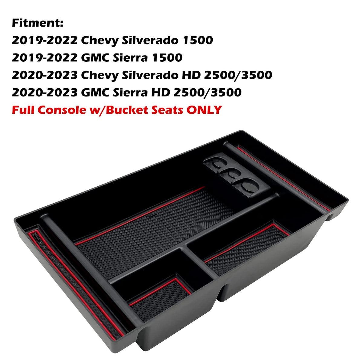 Compatibility: Only fits full console with bucket seats. NOT for split bench seat Fit for GMC Sierra 1500: 2019 2020 2021 Fit for GMC Sierra 2500HD: 2020 2021 Fit for GMC Sierra 3500HD: 2020 2021 Fit for Chevy Silverado 1500: 2019 2020 2021 Fit for Chevy Silverado 2500HD: 2020 2021 Fit for Chevy Silverado 3500HD: 2020 2021