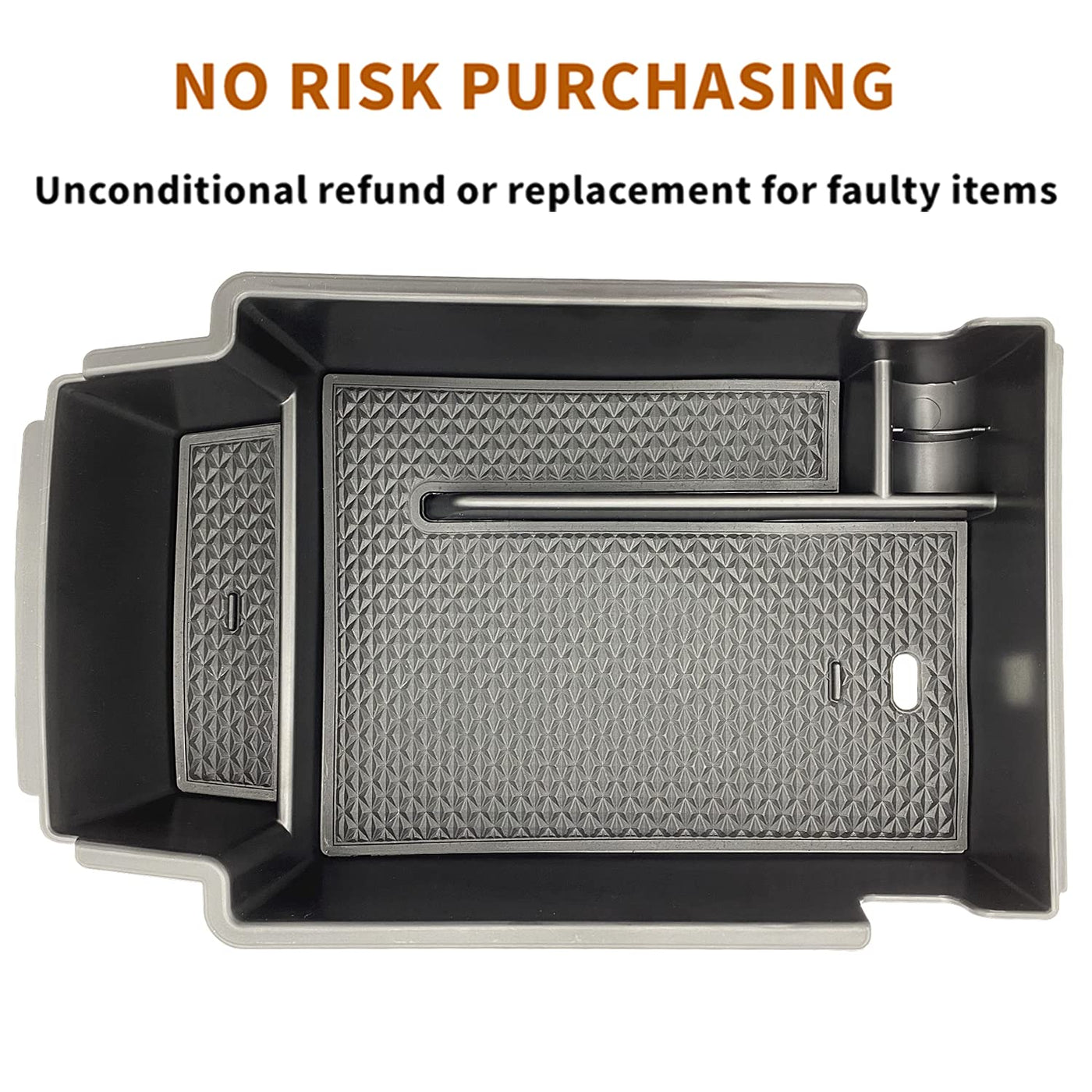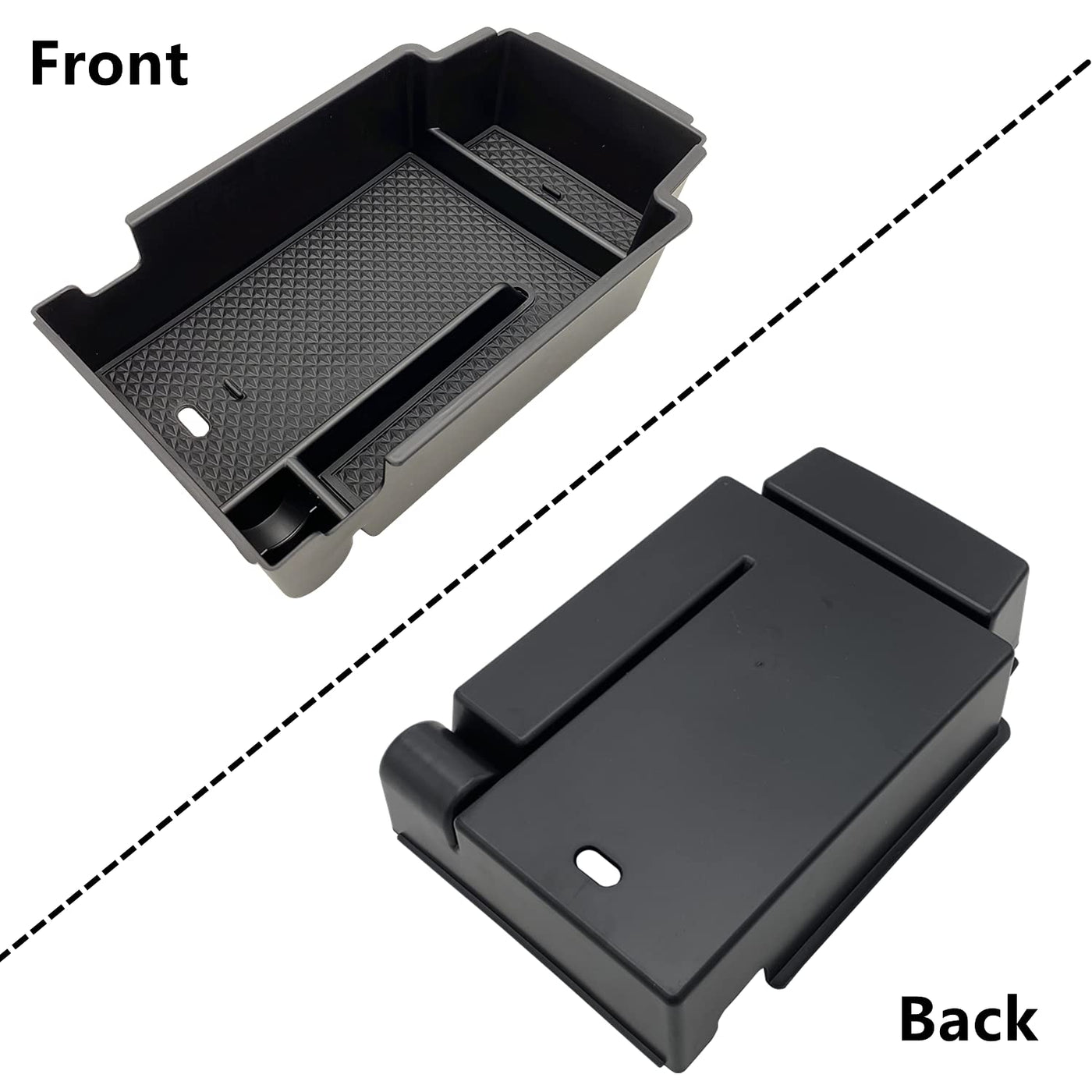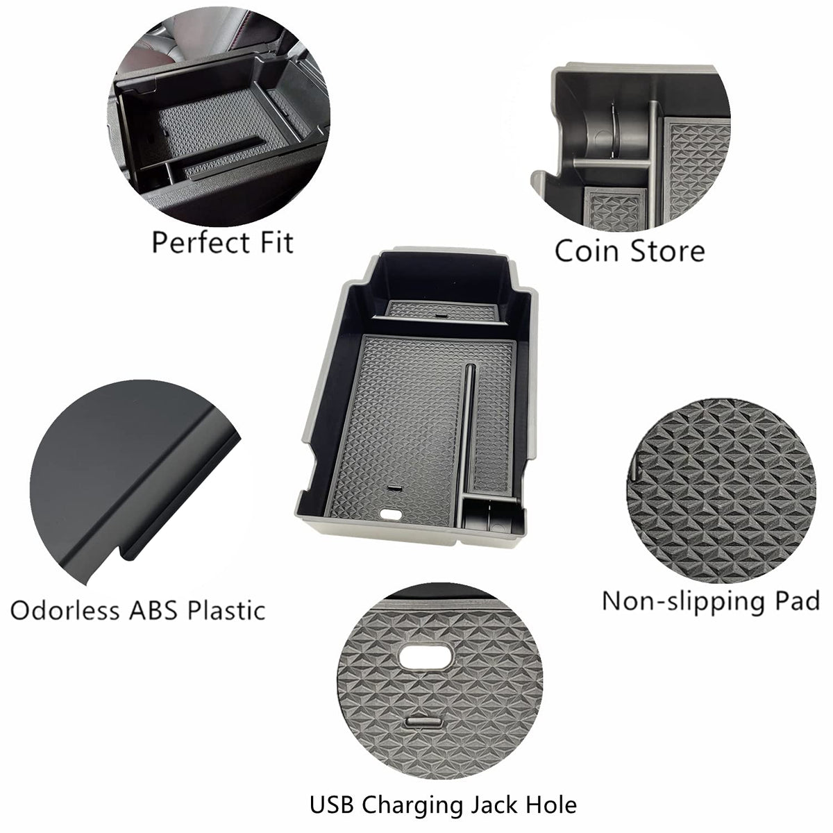 Q: How does the anti-slip feature work in the console organizer?A: The organizer includes a rubber tray liner that prevents items from sliding and rattling within the tray, keeping your belongings secure and organized during drives.