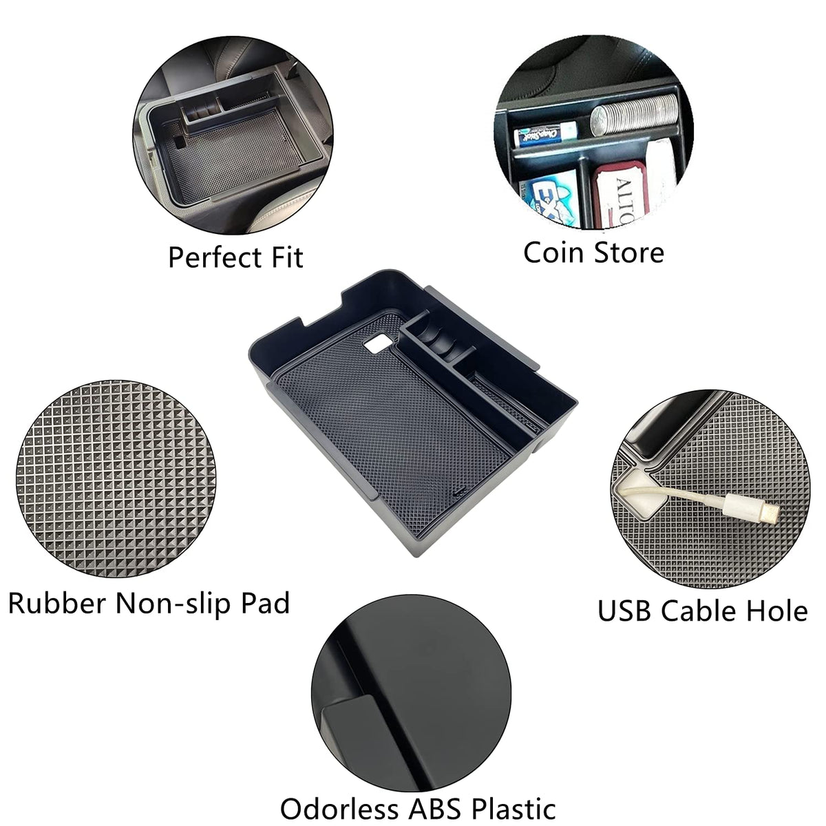 Q: How does the rubber mat help with the organization within the console?A: The included rubber mats prevent items from sliding and rattling, keeping your belongings in place and reducing noise while driving.
