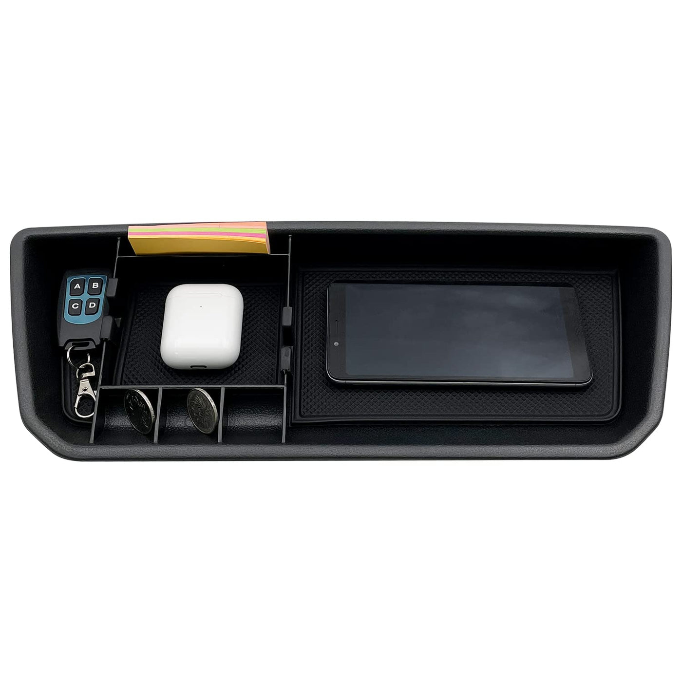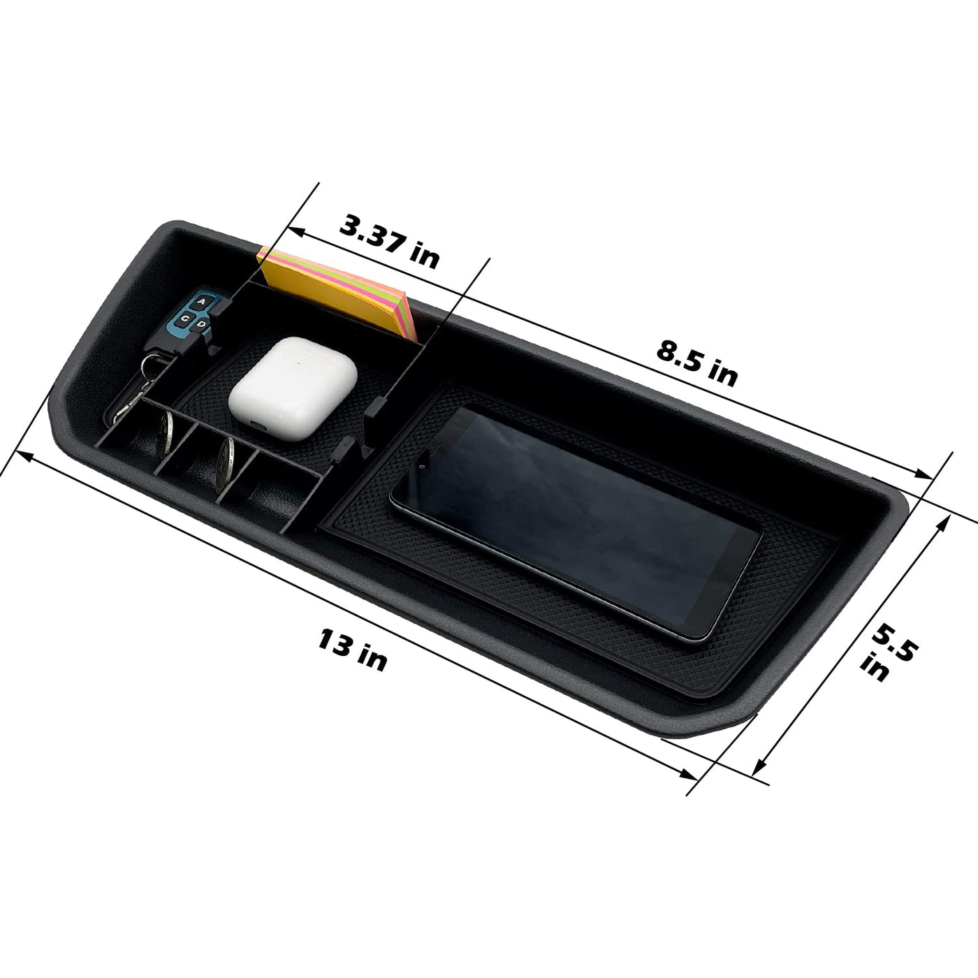 Q: How does the no-slip feature work in this organizer?A: The dashboard organizer includes a rubber tray liner that prevents items from sliding and rattling, keeping your belongings secure and organized while you drive.