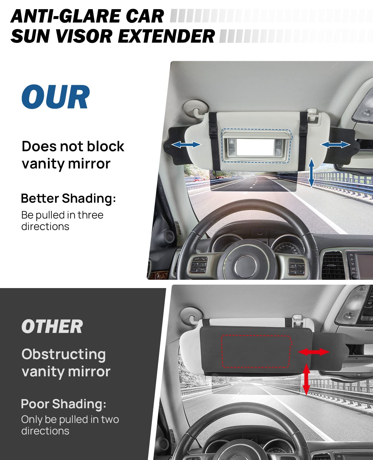 Q: How does the JoyTutus Car Sun Visor Extender block glare?A: The JoyTutus Car Sun Visor Extender features a polycarbonate lens that effectively blocks harsh glare from sunlight, protecting your eyes while driving. It can be adjusted to block sunlight coming from three different directions—left, right, and below—ensuring optimal visibility.