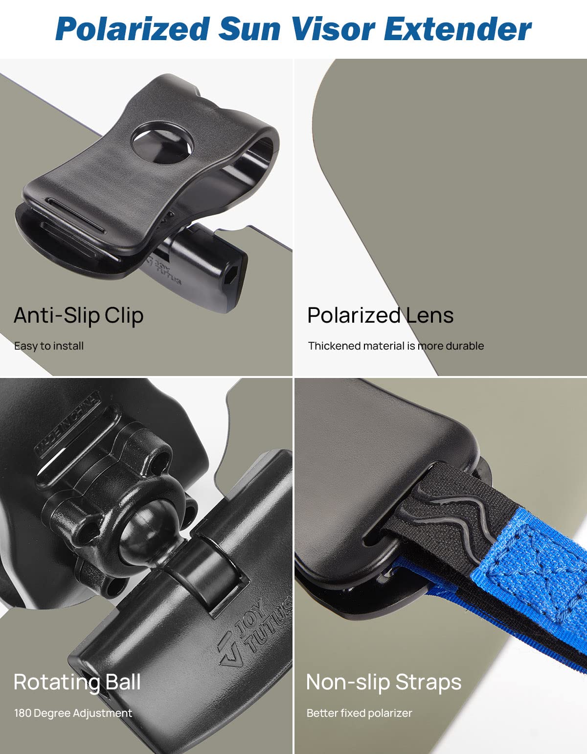 Q: How does the JOYTUTUS Sun Visor Extender reduce glare while driving?A: The JOYTUTUS Sun Visor Extender features a polarized lens that effectively reduces glare from sunlight, enhancing your visibility and providing a clear, comfortable view while driving. This minimizes eye strain and fatigue, particularly during bright conditions.