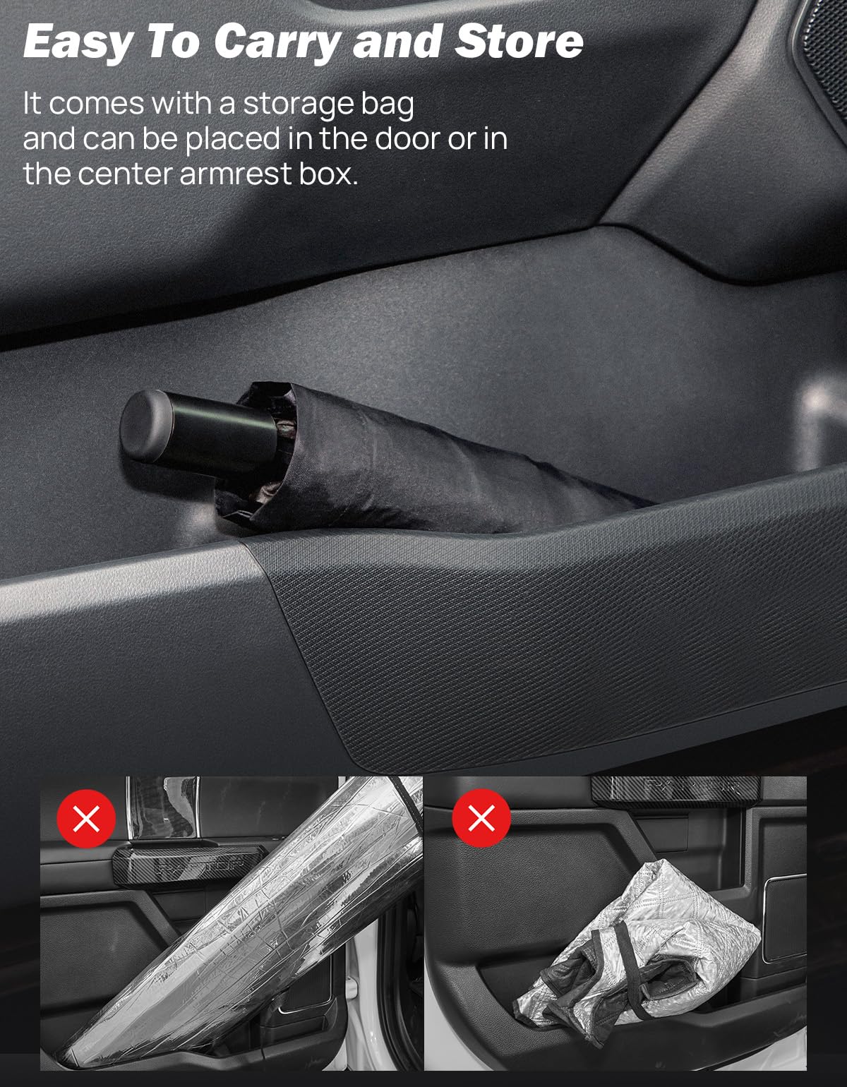 ?Specially Designed?: Have you not found a sunshade umbrella on the market? Do you worry about a scratch on the center console of your car? We have specially customized a sunshade umbrella for the F150. (1) The sunshade's umbrella surface(61''x30'') is fully covered by the windshield, which provides better protection from sun protection. (2) We have added a 360