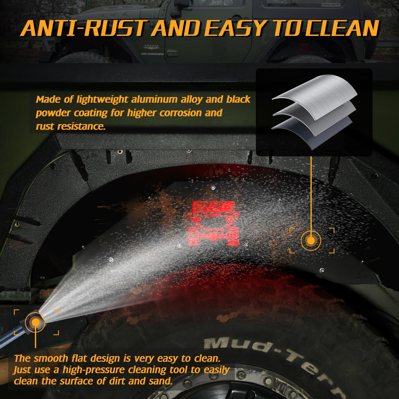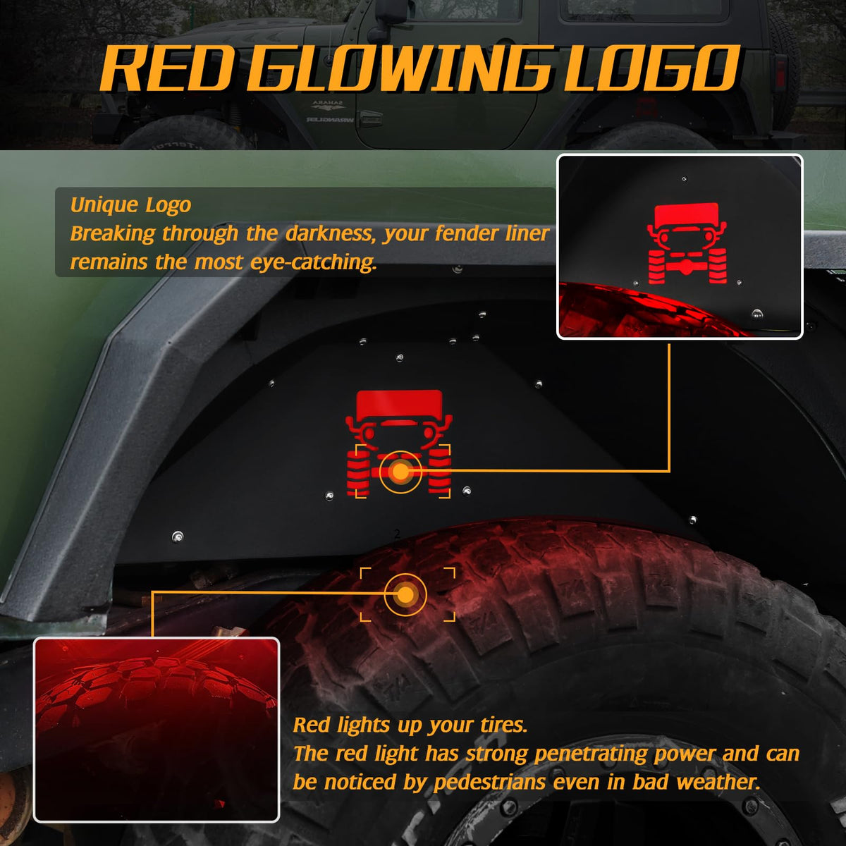 ?Perfect Fit?Designed specifically for 2007-2018 Jeep Wrangler JK JKU 4WD 2/4 Doors, our Rear Inner Fender Liners ensure a perfect fit that follows the body lines of your vehicle. With precise cutting shape and ample space at the top and bottom, these fender liners won't hinder the rotation of your wheels, giving you full functionality off-road. | ?All-around Protective Shield?Constructed from high-strength, corrosion-resistant aluminum alloy, our fender liners provide comprehensive protection for your wheel wells. Whether it's sticks, gravel, mud, snow, or sand, these fender liners act as a shield against off-road elements, preventing damage to your underbody and ensuring a worry-free off-road journey. | ?Unique Red Glowing Logo?Enhance the style and visibility of your Jeep Wrangler JK JKU with our rear inner fender liners. Featuring an eye-catching red glow light pattern, these liners not only add a decorative effect during the day but also improve performance in dark environments. The strong penetrating power of the red light provides increased visibility, serving as a reminder to pedestrians, especially in bad weather conditions. | ?Anti-Rust Aluminum Alloy?Crafted from lightweight and highly corrosion-resistant aluminum alloy, our fender liners are built to last. The black powder-coated texture adds both durability and a sleek appearance. Cleaning is a breeze, thanks to the easy-to-clean surface. Simply use a high-pressure cleaning tool to effortlessly remove dirt and sand, keeping your fender liners looking brand new.