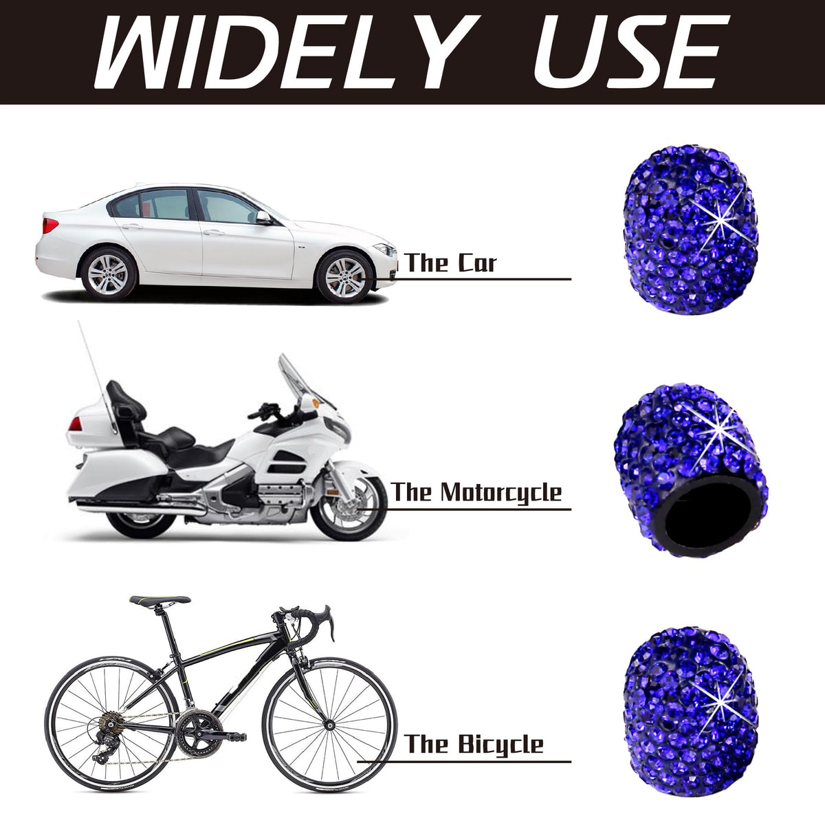 Q: Will these valve caps fit all types of vehicles?A: Yes, the JUSTTOP Crystal Rhinestone Car Tire Valve Stem Caps are universal and are compatible with most cars, trucks, and motorcycles, making them a versatile accessory for various vehicles.