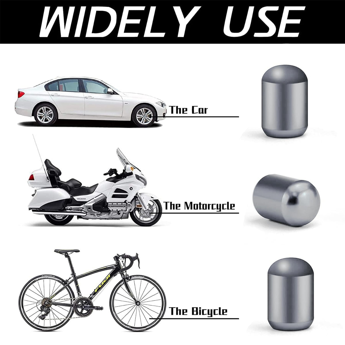 Q: Are these valve stem caps compatible with all vehicle types?A: Yes, these valve stem caps have a universal size that fits a wide range of vehicles including cars, SUVs, trucks, motorcycles, bikes, and bicycles.