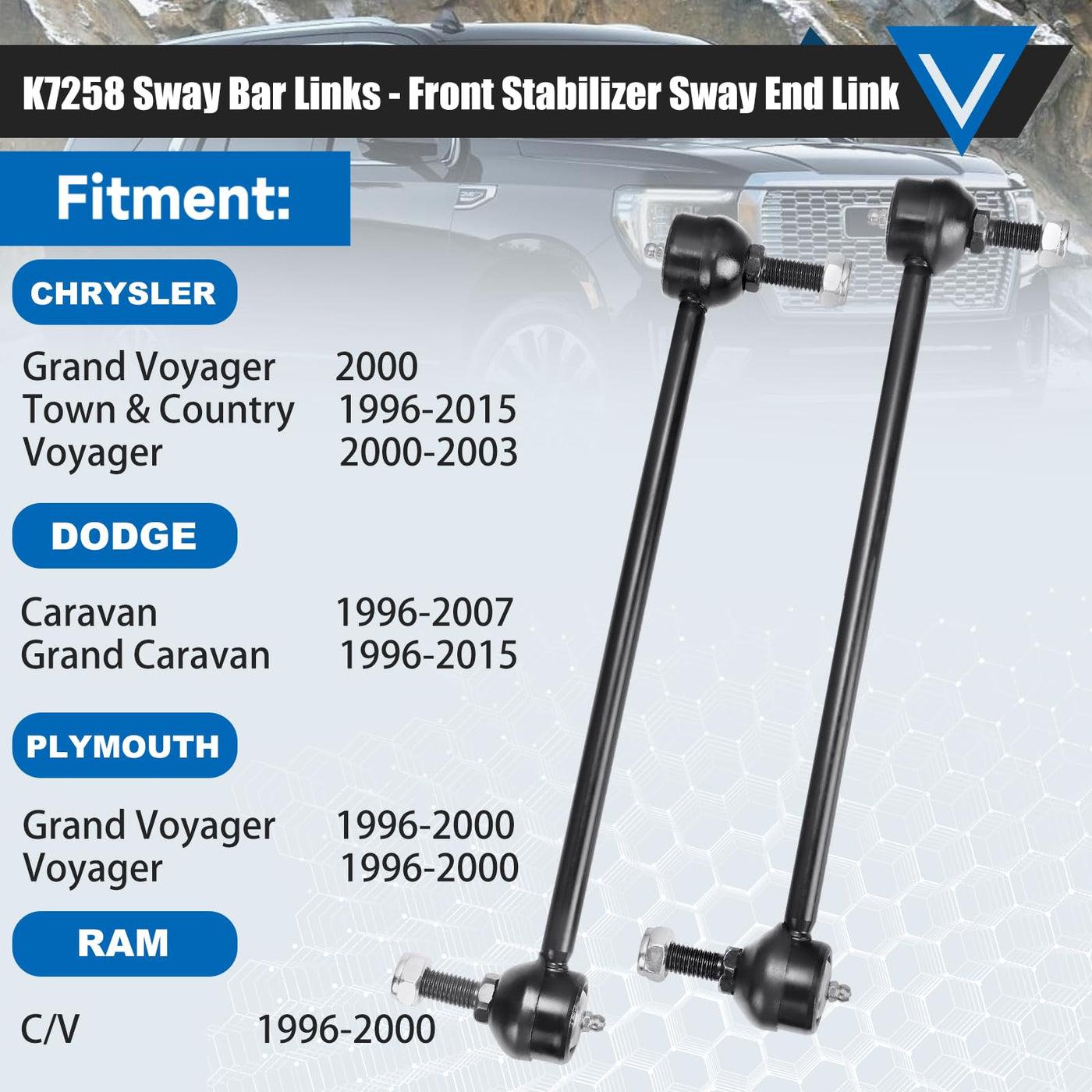 Q: Is the K7258 Front Stabilizer Sway Bar Link compatible with my vehicle?A: Yes, the K7258 Front Stabilizer Sway Bar Link is compatible with various models, including Chrysler Grand Voyager, Town & Country, Voyager, Caravan, Grand Caravan, Plymouth Grand Voyager, and Ram C/V from 1996 to 2015.