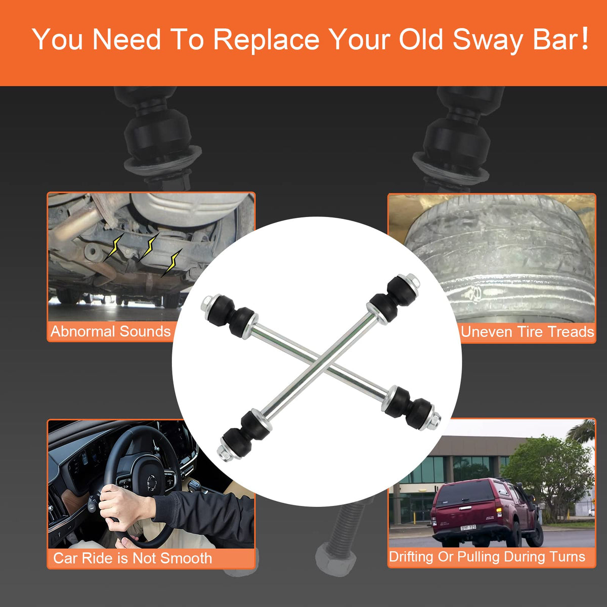 Q: What are the symptoms of a failing sway bar link?A: Common symptoms of a failing sway bar link include abnormal noises such as clunking or rattling, uneven tire wear, a rough ride, and drifting or pulling during turns. If you experience any of these issues, it's advisable to inspect your sway bar link kit.