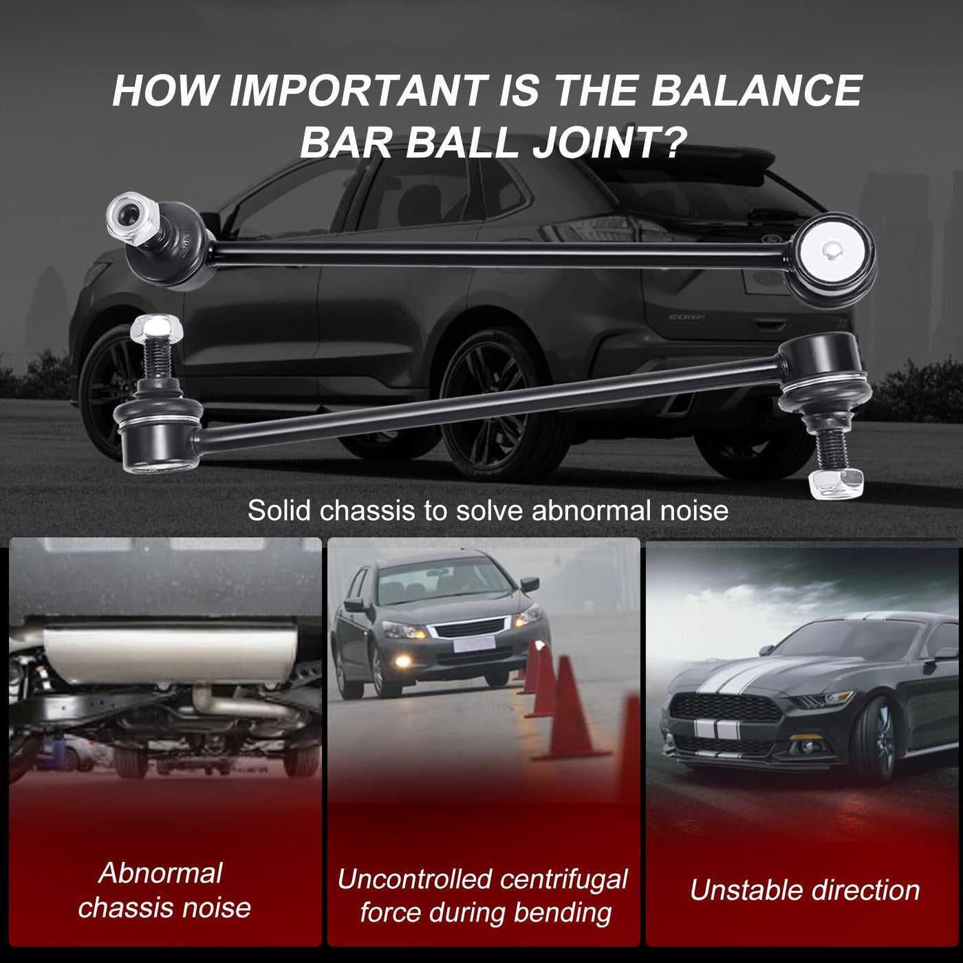 What happens when car sway bar end link fails? Abnormal Sounds stabilizer bar suspension noise such as clunking,ratting or popping on rough roads. Uneven Tire Treads If you notice the tread is wearing down unevenly on your tires, or if you notice balding spots, this is often a symptom that the suspension isn't holding the car evenly, and therefore putting uneven amounts of pressure on the tires. Car Ride is Not Smooth When you begin to feel every bump in the road, or when every bump causes the vehicle body to ''bounce'' ,you should check if some of your sway link kit parts have been worn out. Drifting Or Pulling During Turns With a failing sway bar suspension, you'll often feel the vehicle ''drift'' or ''pull'' when turning. Feature: Easy To Turn Easy To Install Reduce The Noise Strong And Long-lasting Protecting The Tire Better Anti-roll Control Improving Driving Comfort Improving Driving Stability