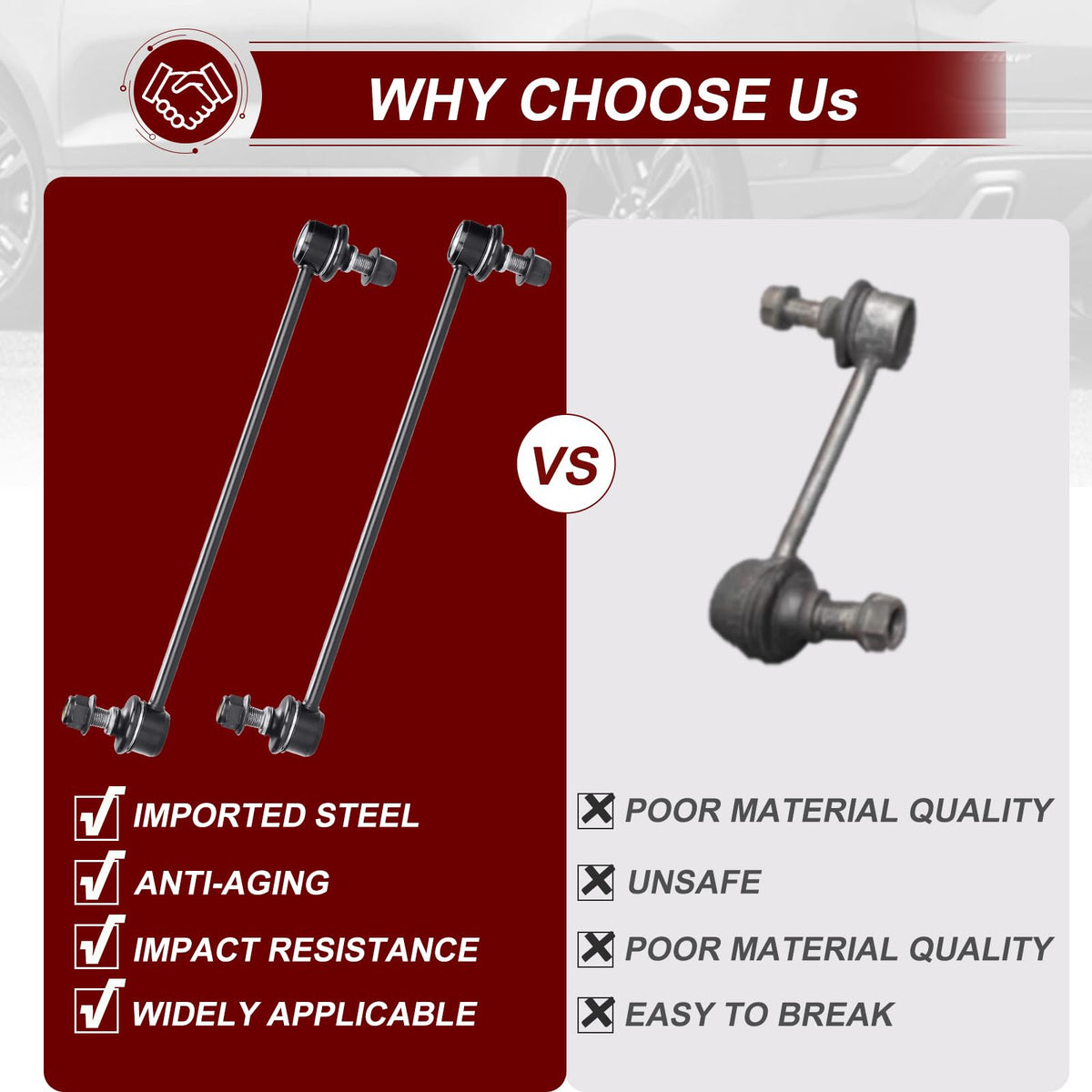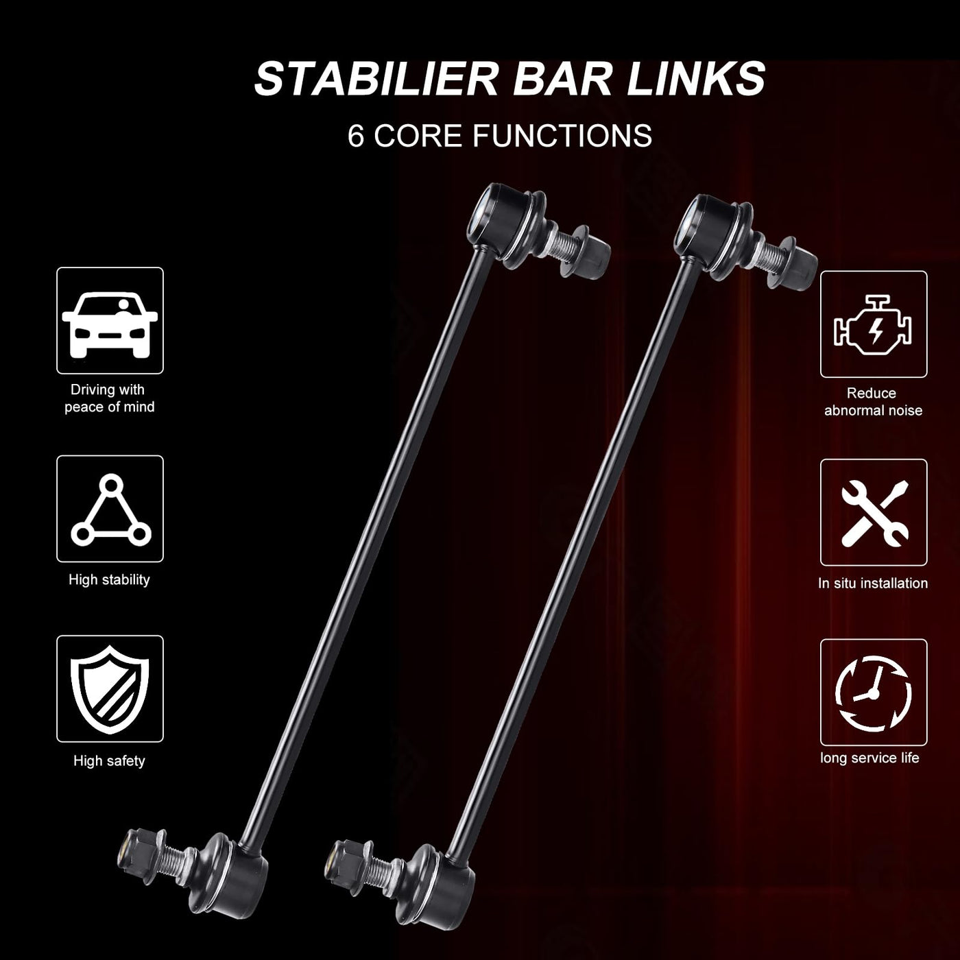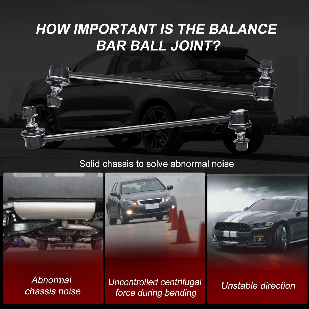 What happens when car sway bar end link fails? Abnormal Sounds stabilizer bar suspension noise such as clunking,ratting or popping on rough roads. Uneven Tire Treads If you notice the tread is wearing down unevenly on your tires, or if you notice balding spots, this is often a symptom that the suspension isn't holding the car evenly, and therefore putting uneven amounts of pressure on the tires. Car Ride is Not Smooth When you begin to feel every bump in the road, or when every bump causes the vehicle body to ''bounce'' ,you should check if some of your sway link kit parts have been worn out. Drifting Or Pulling During Turns With a failing sway bar suspension, you'll often feel the vehicle ''drift'' or ''pull'' when turning. Feature: Easy To Turn Easy To Install Reduce The Noise Strong And Long-lasting Protecting The Tire Better Anti-roll Control Improving Driving Comfort Improving Driving Stability