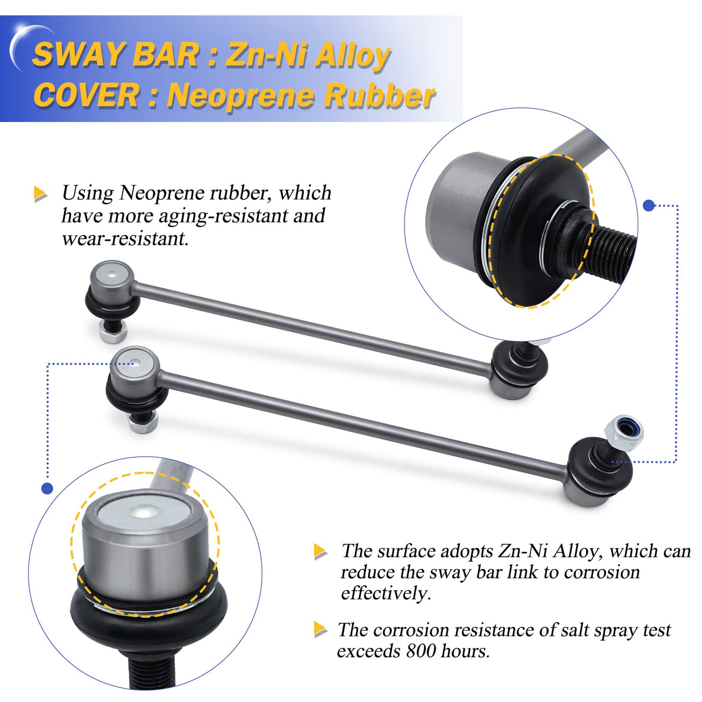 Q: What materials are the K750523 sway bar links made from?A: The K750523 sway bar links are constructed from high-quality materials, including a Zinc-Nickel alloy coating to prevent rust and improve corrosion resistance. The rubber components used have enhanced resistance to oxidation and abrasion, ensuring longevity and durability in various driving conditions.