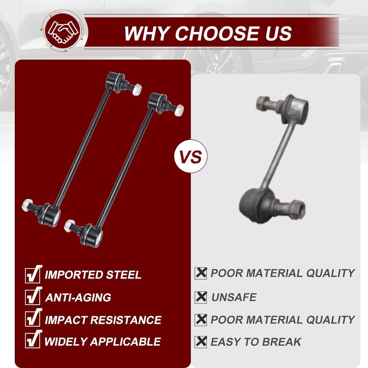 What happens when car sway bar end link fails? Abnormal Sounds stabilizer bar suspension noise such as clunking,ratting or popping on rough roads. Uneven Tire Treads If you notice the tread is wearing down unevenly on your tires, or if you notice balding spots, this is often a symptom that the suspension isn't holding the car evenly, and therefore putting uneven amounts of pressure on the tires. Car Ride is Not Smooth Feature: Easy To Turn Easy To Install Reduce The Noise Strong And Long-lasting Protecting The Tire Better Anti-roll Control Improving Driving Comfort Improving Driving Stability