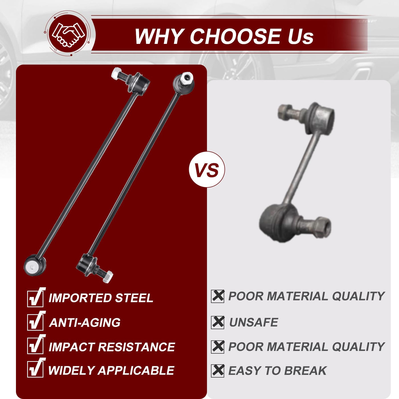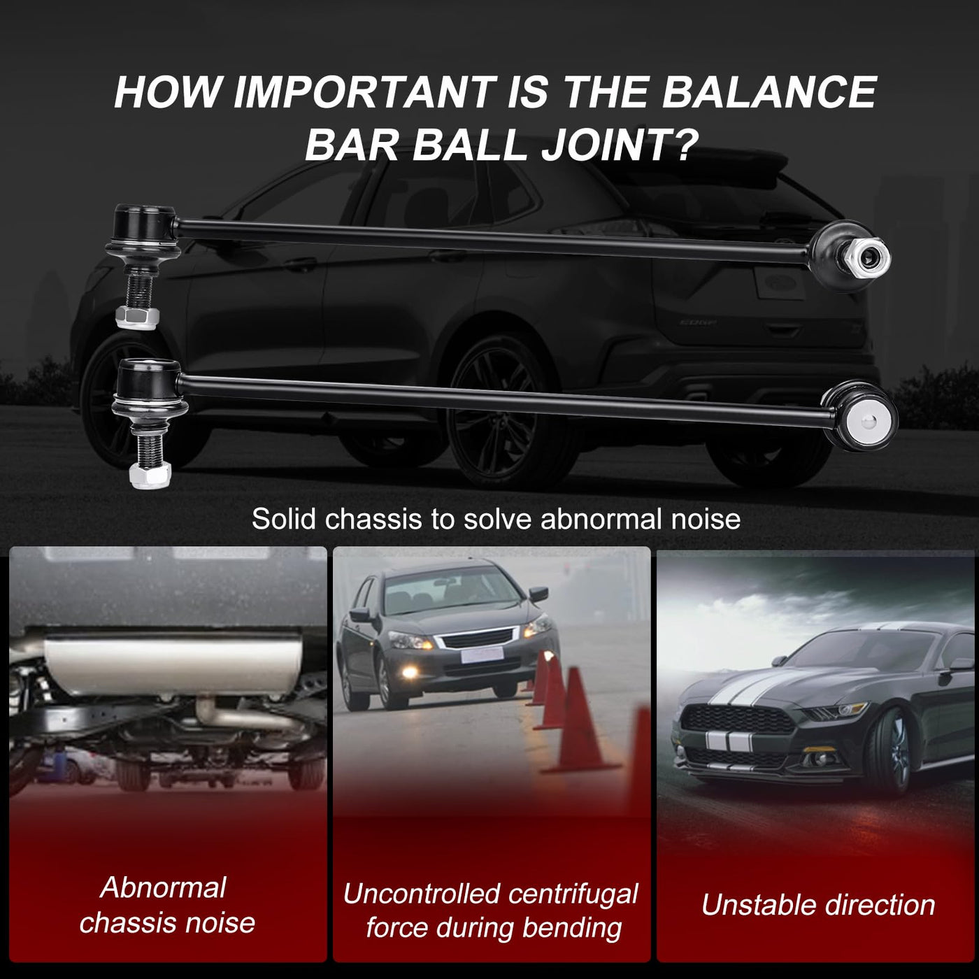 What happens when car sway bar end link fails? Abnormal Sounds stabilizer bar suspension noise such as clunking,ratting or popping on rough roads. Uneven Tire Treads If you notice the tread is wearing down unevenly on your tires, or if you notice balding spots, this is often a symptom that the suspension isn't holding the car evenly, and therefore putting uneven amounts of pressure on the tires. Car Ride is Not Smooth When you begin to feel every bump in the road, or when every bump causes the vehicle body to ''bounce'' ,you should check if some of your sway link kit parts have been worn out. Drifting Or Pulling During Turns With a failing sway bar suspension, you'll often feel the vehicle ''drift'' or ''pull'' when turning. Feature: Easy To Turn Easy To Install Reduce The Noise Strong And Long-lasting Protecting The Tire Better Anti-roll Control Improving Driving Comfort Improving Driving Stability