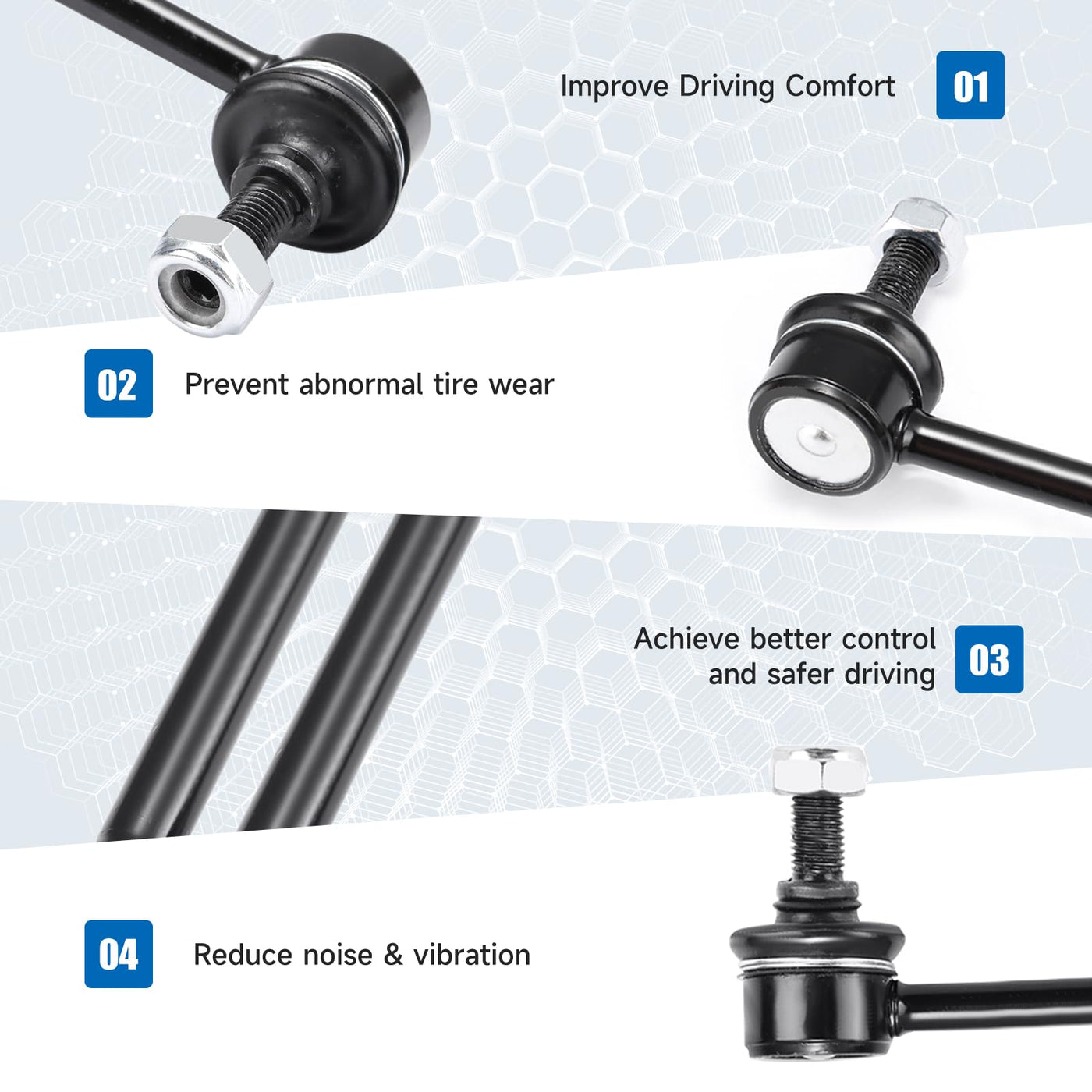 What happens when car sway bar end link fails? Abnormal Sounds stabilizer bar suspension noise such as clunking,ratting or popping on rough roads. Uneven Tire Treads If you notice the tread is wearing down unevenly on your tires, or if you notice balding spots, this is often a symptom that the suspension isn't holding the car evenly, and therefore putting uneven amounts of pressure on the tires. Car Ride is Not Smooth Feature: Easy To Turn Easy To Install Reduce The Noise Strong And Long-lasting Protecting The Tire Better Anti-roll Control Improving Driving Comfort Improving Driving Stability