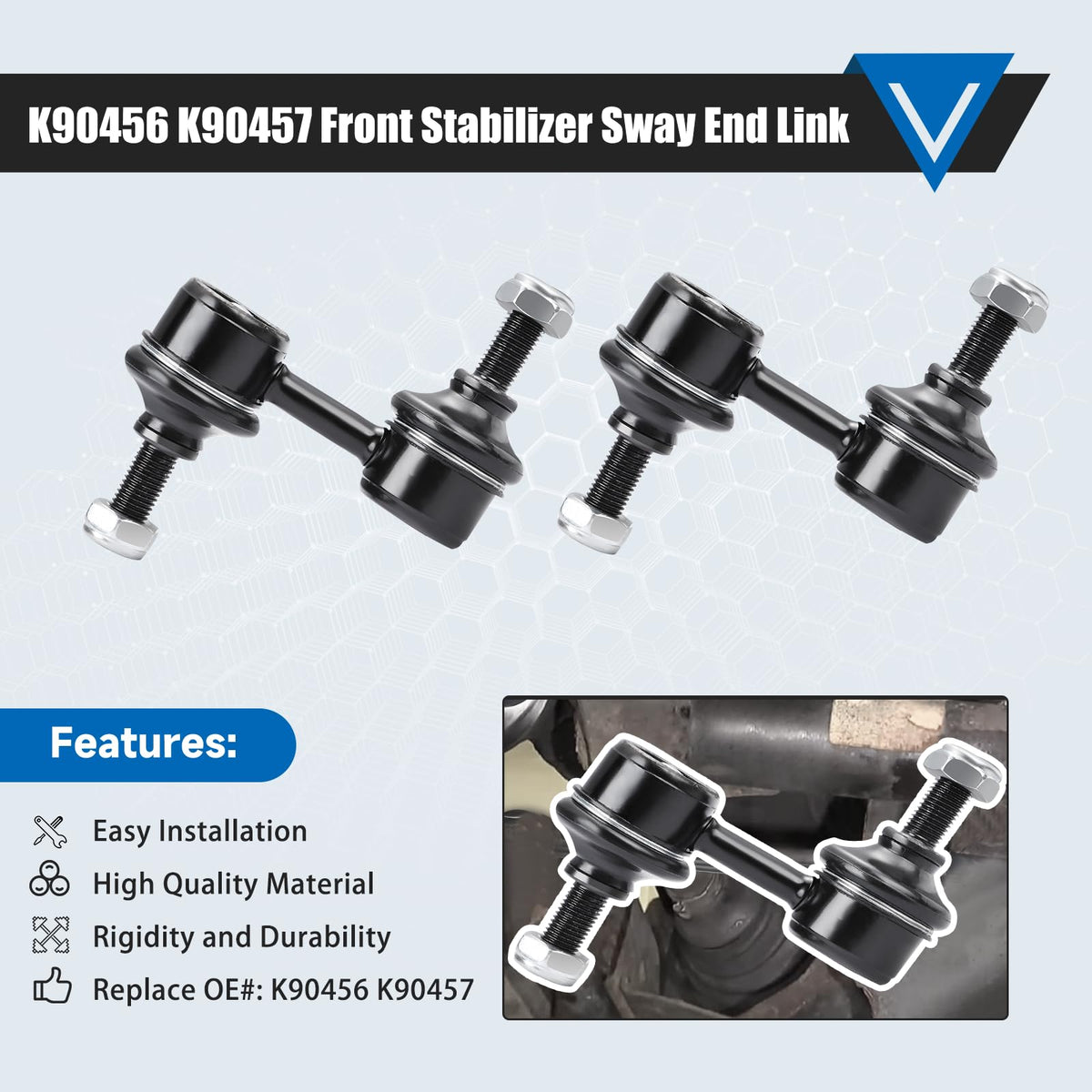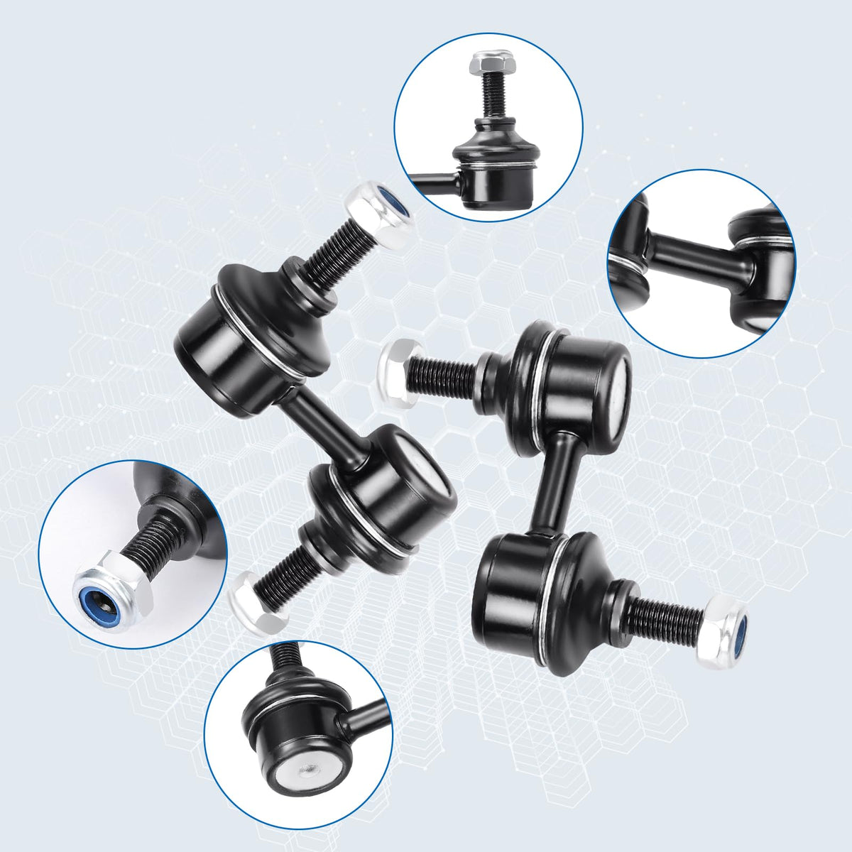 What happens when car sway bar end link fails? Abnormal Sounds stabilizer bar suspension noise such as clunking,ratting or popping on rough roads. Uneven Tire Treads If you notice the tread is wearing down unevenly on your tires, or if you notice balding spots, this is often a symptom that the suspension isn't holding the car evenly, and therefore putting uneven amounts of pressure on the tires. Car Ride is Not Smooth When you begin to feel every bump in the road, or when every bump causes the vehicle body to ''bounce'' ,you should check if some of your sway link kit parts have been worn out. Drifting Or Pulling During Turns With a failing sway bar suspension, you'll often feel the vehicle ''drift'' or ''pull'' when turning. Feature: Easy To Turn Easy To Install Reduce The Noise Strong And Long-lasting Protecting The Tire Better Anti-roll Control Improving Driving Comfort Improving Driving Stability