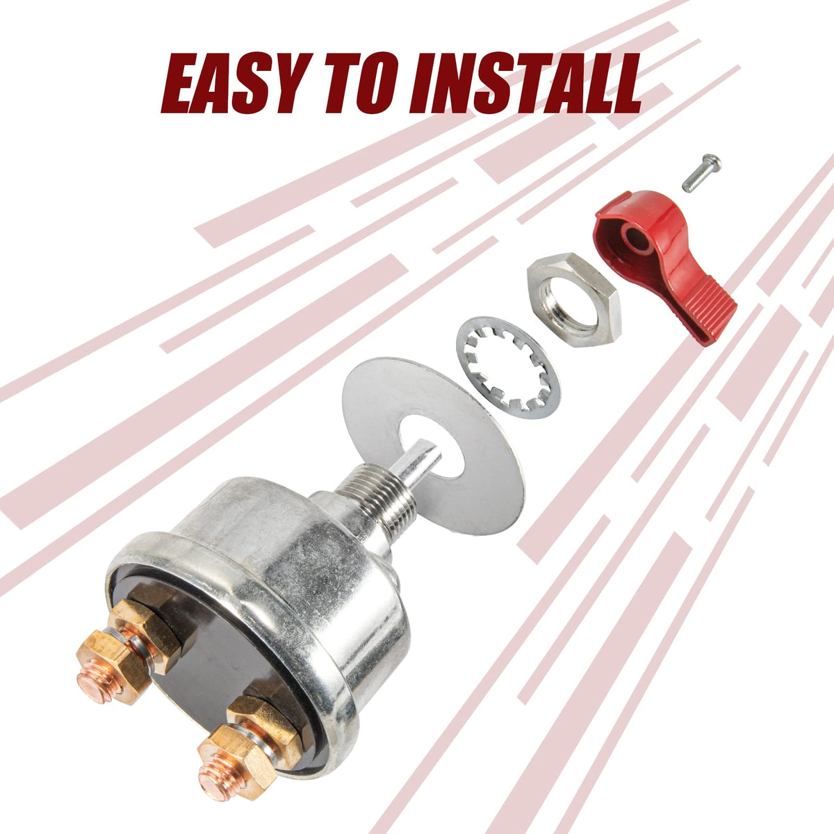 Q: Is the installation of the battery isolator switch complicated?A: No, the KACOLA Battery Disconnect Switch is easy to install. It comes with a clearly labeled faceplate indicating off and on positions, and includes 3/8” brass studs with nuts and locking washers for secure installation.