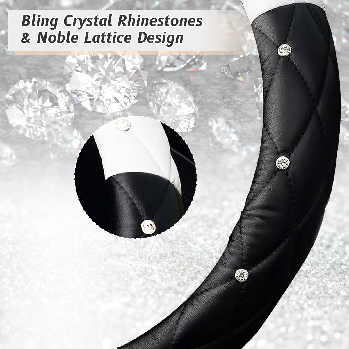Kafeek Diamond Soft Leather Steering Wheel Cover With Bling Bling Crystal Rhinestones, Universal 15 Inch, Black White