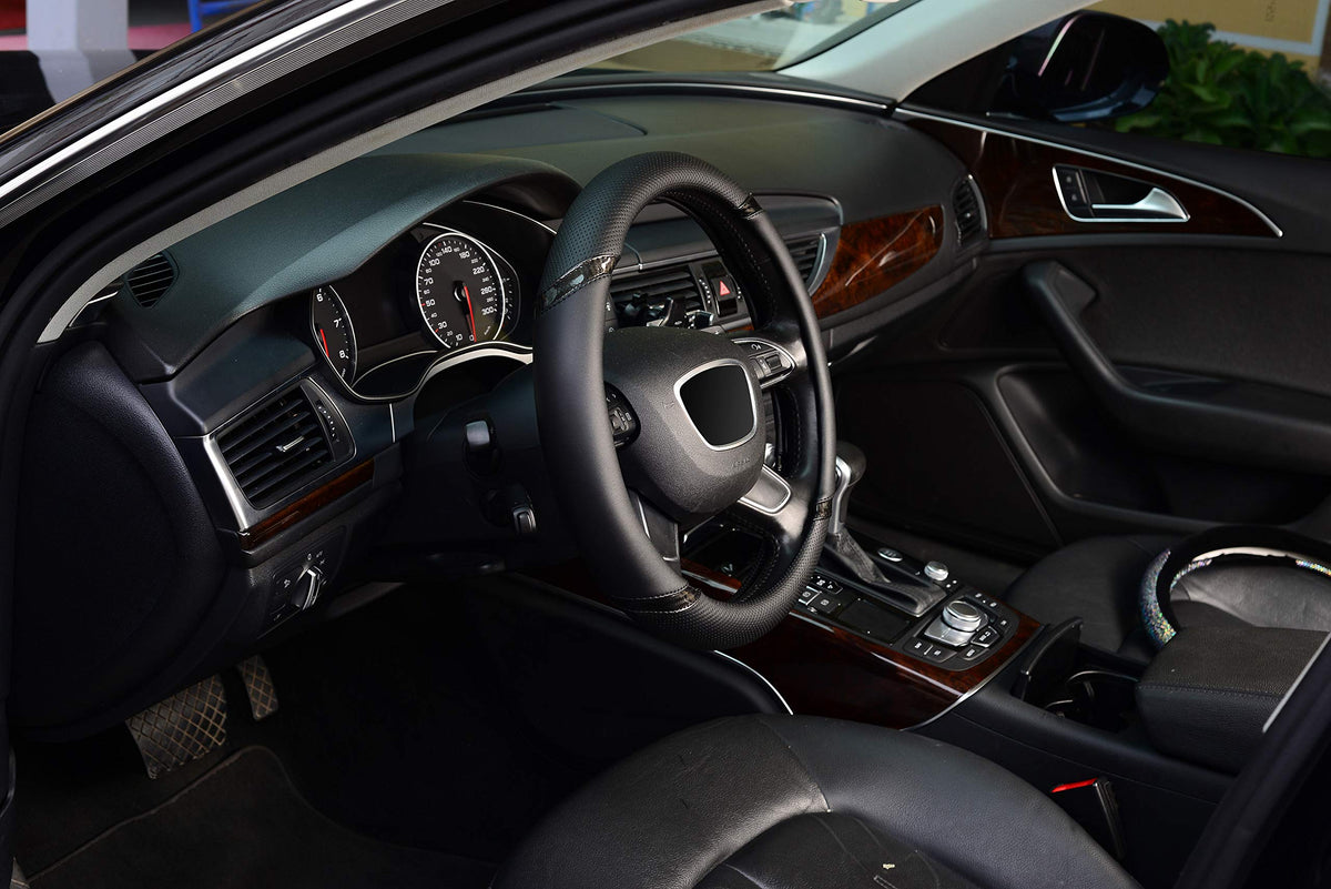 KAFEEK 15 Inch middle size leather steering wheel cover It fits for steering wheels with outside diameter of 14 1/2 to 15 inch.Skidproof, heat resistant.Inside skidproof rubber lining ensures a constant reliable grip. Breathable design for better cooling and added comfort.It can not only decorate your car steering wheel, protect from stains and scratches but also hide existing wear and keep your steering wheel looking new. This premium product is an excellent gift choice for anyone close to you on example their birthday, Christmas or any other suitable occasion. How to install If it is difficult to put it on at first time,because it has kind of hard rubber coating inside,you can heat it up a little under the sun to soften the rubber then put it while its warm. Its easier to stretch it a little. 1.Turn off the engine, make sure the steering wheel keep fixed. 2. Put the steering wheel cover on the top of steering wheel, pull tight the steering wheel cover from top to about half both side. 3. Turn out the edge of the rest cover and keep it touching the steering wheel's edge, then keep pulling tight the steering wheel cover from side to bottom. 4. Fix the bottom of steering wheel cover, then rotate and adjust the wheel cover to the best situation. Package includes 1pcs Steering Wheel Cover. If you are not sure whether our products fit your car,you may leave us a message.It is our pleasure to answer your questions.