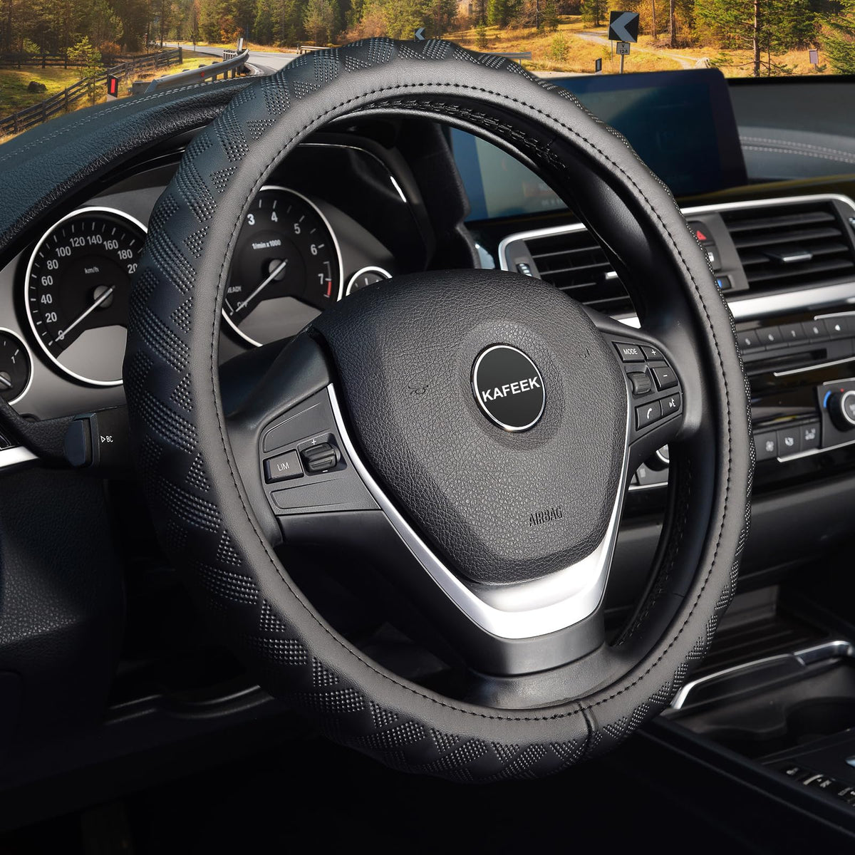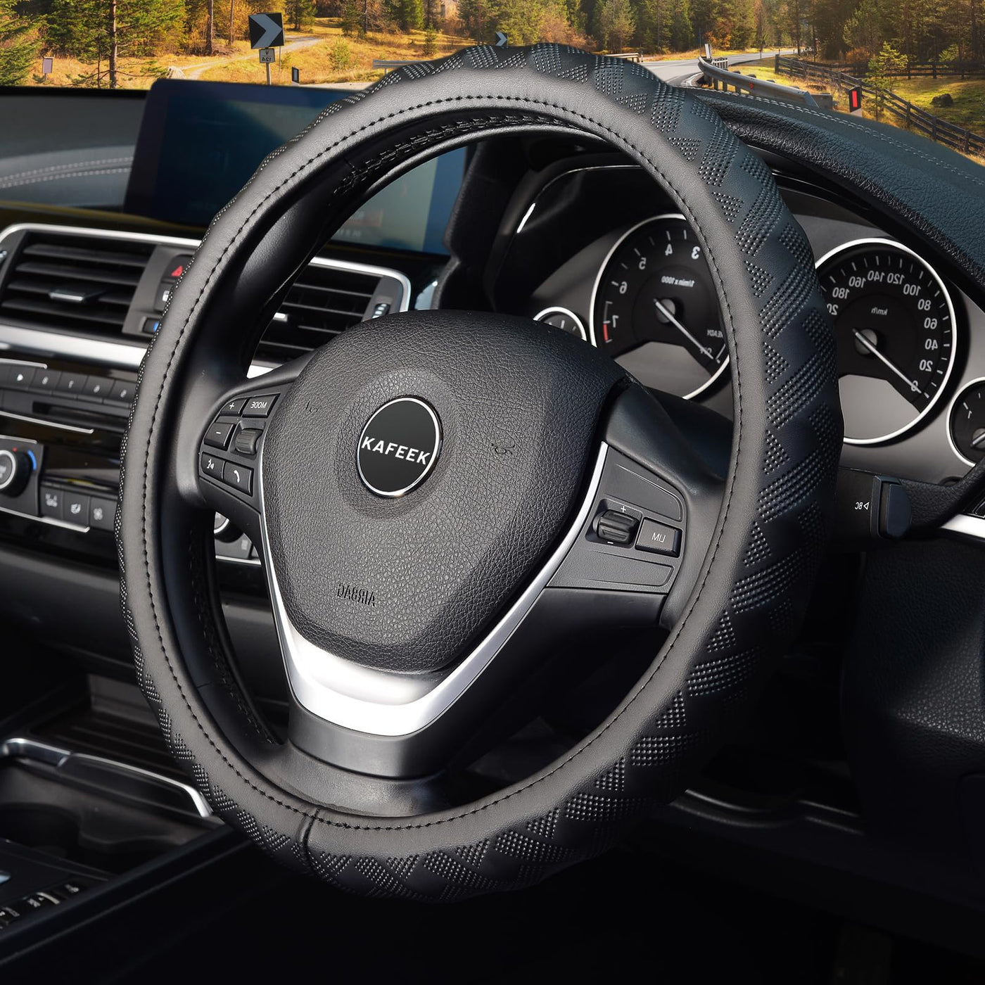 KAFEEK 15 Inch middle size leather steering wheel cover It fits for steering wheels with outside diameter of 14 1/2 to 15 inch.Skidproof, heat resistant.Inside skidproof rubber lining ensures a constant reliable grip. Breathable design for better cooling and added comfort.It can not only decorate your car steering wheel, protect from stains and scratches but also hide existing wear and keep your steering wheel looking new. This premium product is an excellent gift choice for anyone close to you on example their birthday, Christmas or any other suitable occasion. How to install If it is difficult to put it on at first time,because it has kind of hard rubber coating inside,you can heat it up a little under the sun to soften the rubber then put it while its warm. Its easier to stretch it a little. 1.Turn off the engine, make sure the steering wheel keep fixed. 2. Put the steering wheel cover on the top of steering wheel, pull tight the steering wheel cover from top to about half both side. 3. Turn out the edge of the rest cover and keep it touching the steering wheel's edge, then keep pulling tight the steering wheel cover from side to bottom. 4. Fix the bottom of steering wheel cover, then rotate and adjust the wheel cover to the best situation. Package includes 1pcs Steering Wheel Cover. If you are not sure whether our products fit your car,you may leave us a message.It is our pleasure to answer your questions. Need more steering wheel covers? Just click into our KAFEEK brand or search for KAFEEK steering wheel cover.