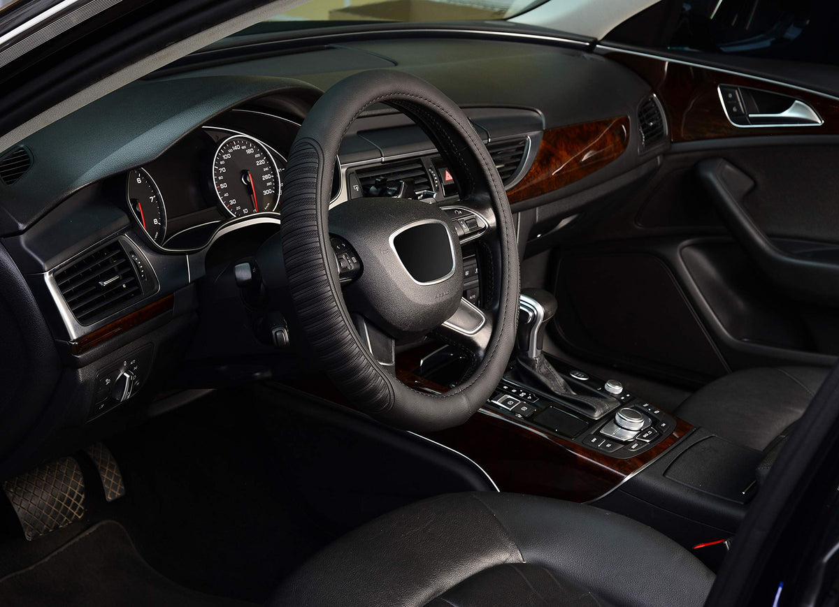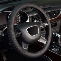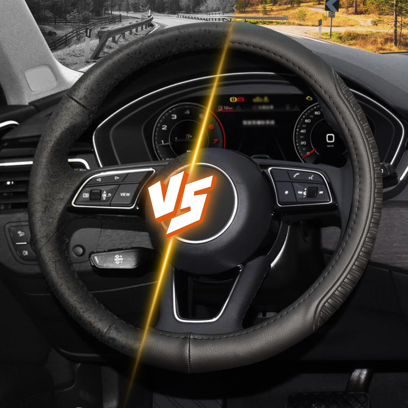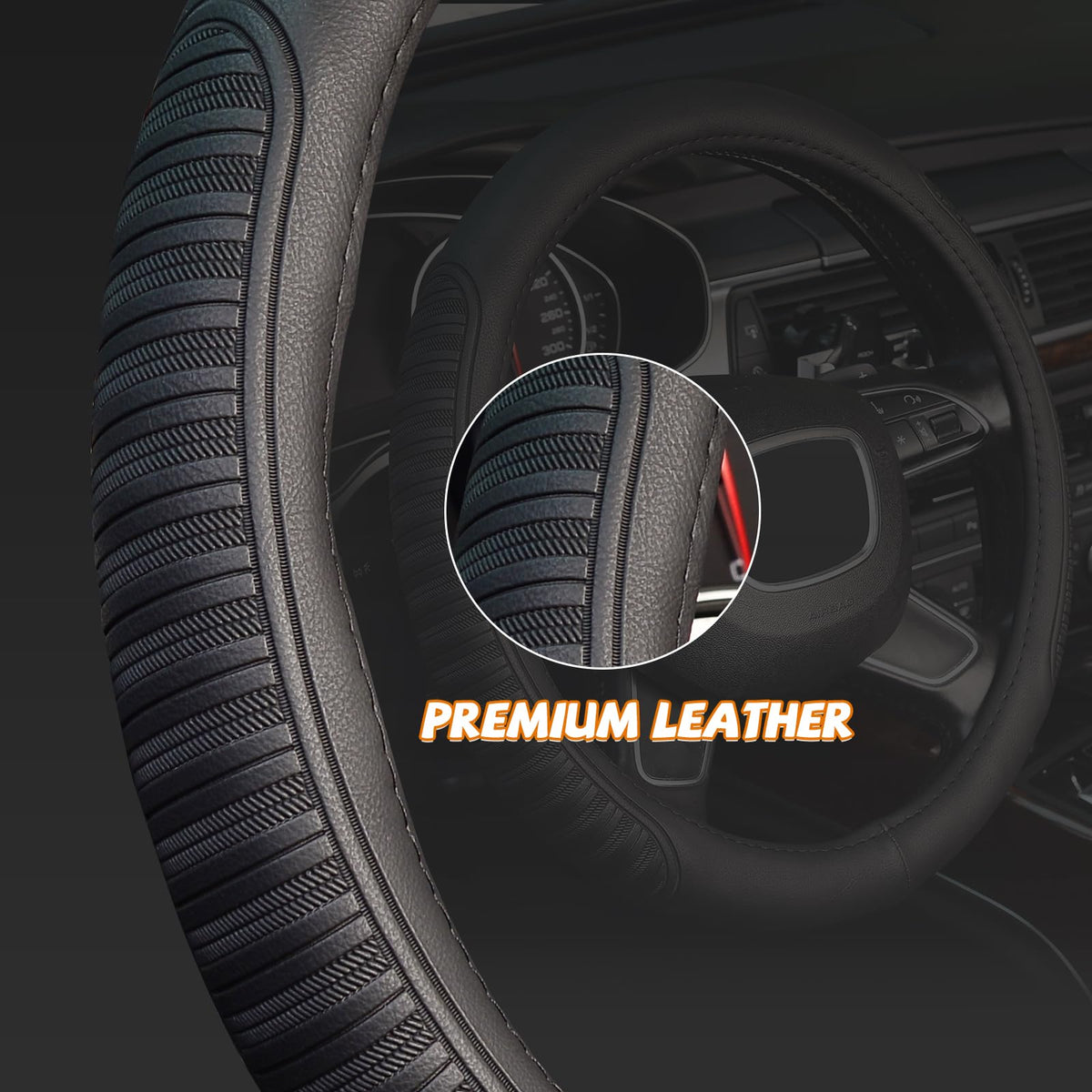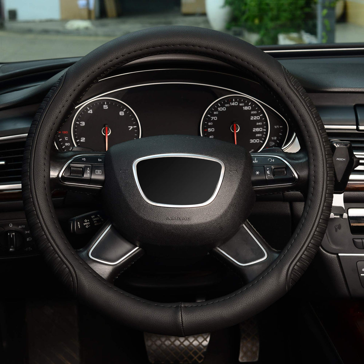 KAFEEK 15 Inch middle size leather steering wheel cover It fits for steering wheels with outside diameter of 14 1/2 to 15 inch.Skidproof, heat resistant.Inside skidproof rubber lining ensures a constant reliable grip. Breathable design for better cooling and added comfort.It can not only decorate your car steering wheel, protect from stains and scratches but also hide existing wear and keep your steering wheel looking new. This premium product is an excellent gift choice for anyone close to you on example their birthday, Christmas or any other suitable occasion. How to install If it is difficult to put it on at first time,because it has kind of hard rubber coating inside,you can heat it up a little under the sun to soften the rubber then put it while its warm. Its easier to stretch it a little. 1.Turn off the engine, make sure the steering wheel keep fixed. 2. Put the steering wheel cover on the top of steering wheel, pull tight the steering wheel cover from top to about half both side. 3. Turn out the edge of the rest cover and keep it touching the steering wheel's edge, then keep pulling tight the steering wheel cover from side to bottom. 4. Fix the bottom of steering wheel cover, then rotate and adjust the wheel cover to the best situation. Package includes 1pcs Steering Wheel Cover. If you are not sure whether our products fit your car,you may leave us a message.It is our pleasure to answer your questions. Need more steering wheel covers? Just click into our KAFEEK brand or search for KAFEEK steering wheel cover.