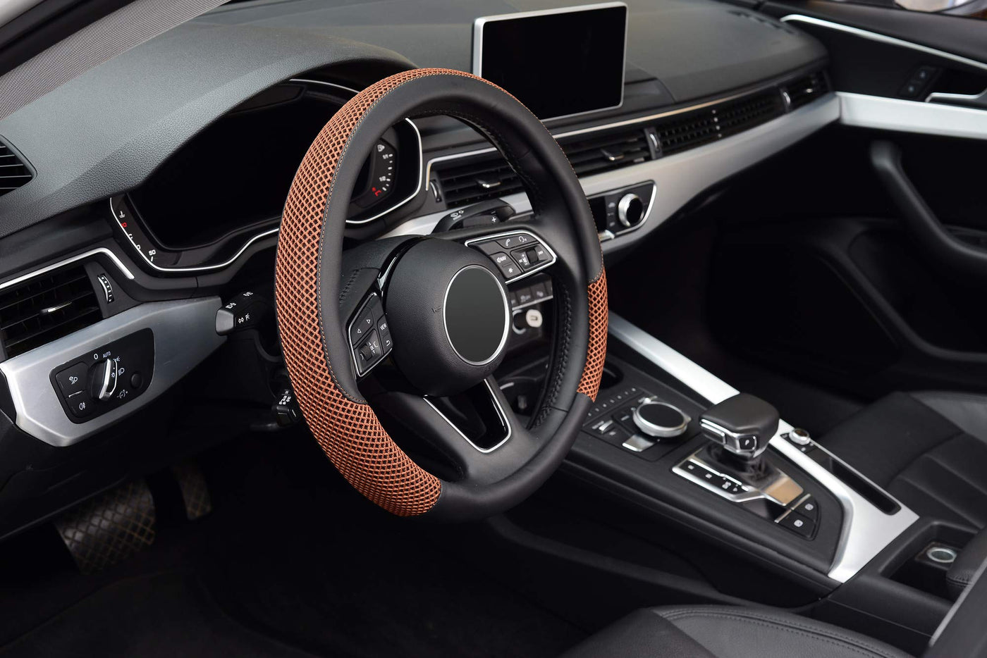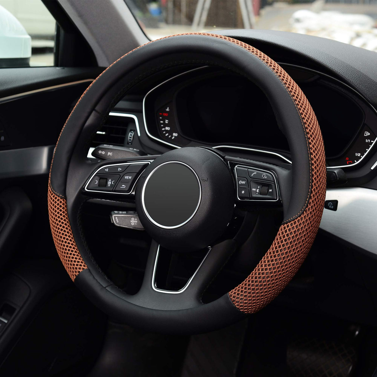 Q: What materials are used in the KAFEEK Steering Wheel Cover?A: The cover is made from durable microfiber leather and breathable silk mesh, offering a healthy and eco-friendly option that ensures a great touch and feel while being warm in winter and cool in summer.