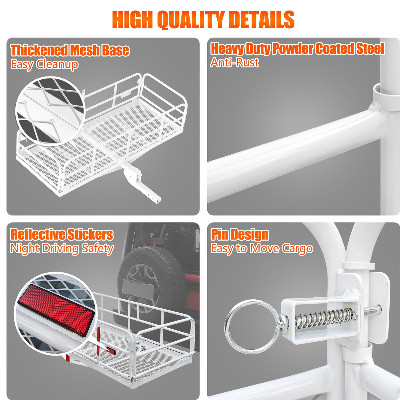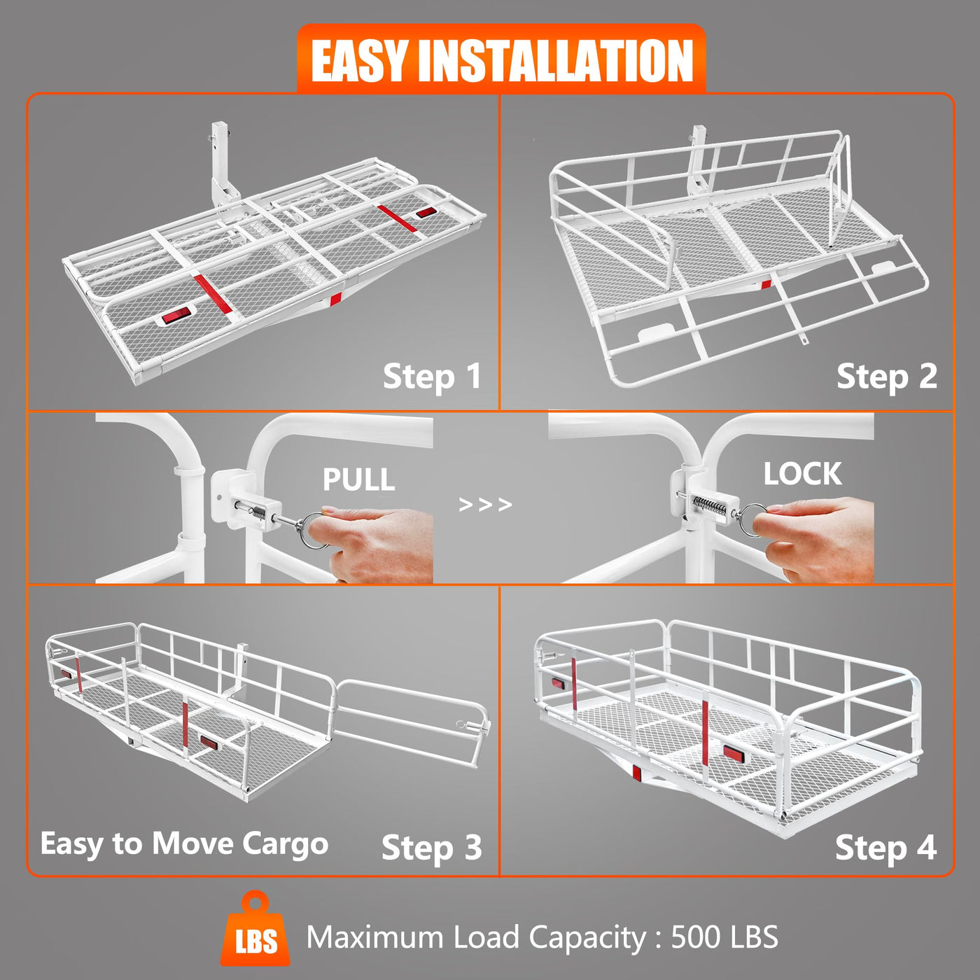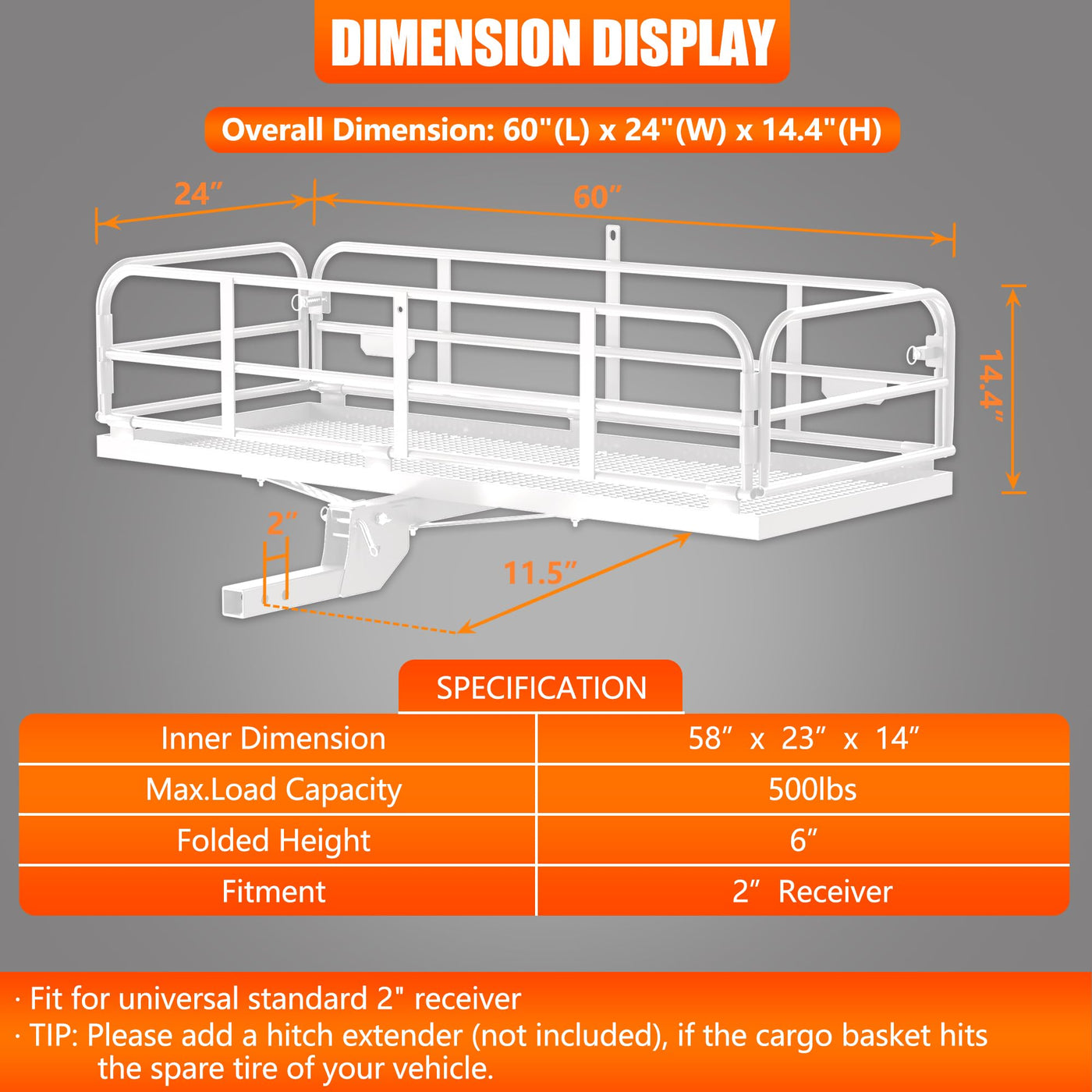 KAIRAY Steel Luggage Basket, which allows you to store bags, camping equipment, luggage and more. It utilizes your vehicle's cross bars, easily mounting. This item is constructed of steel construction. The bars and side rails help keep your belongings in place, providing plenty of room for tie down points as well. Really good choice for long road trip with a large group of people or friends. Specifications: Color: White Material: Steel Max Loading Capacity : 400 LBS Basket Dimensions: 60''x 24''x 14.4'' (L x W x H) Folded Height: 2.8'' Item Weight: 27KG/59.6 Lbs Foldable Cargo Carrier: Yes Assembly Require: Yes Foldable receiver tube Fits standard 2'' hitch cargo carrier receiver Package Included: Hitch Mount Cargo Carrier Hardware Set Features: ? Made of heavy duty steel, which is very durable and sturdy ? Loading capacity can reach 500 lbs, used for store extra luggage ? 14.4'' Side rail- higher than most other cargo carriers ? Mesh surface- prevents smaller objects from falling through ? 2 Red reflectors ensure safety in severe weather ? Foldable receiver tube as the optimal design- More convenience to fold when not in use; heavy duty steel f