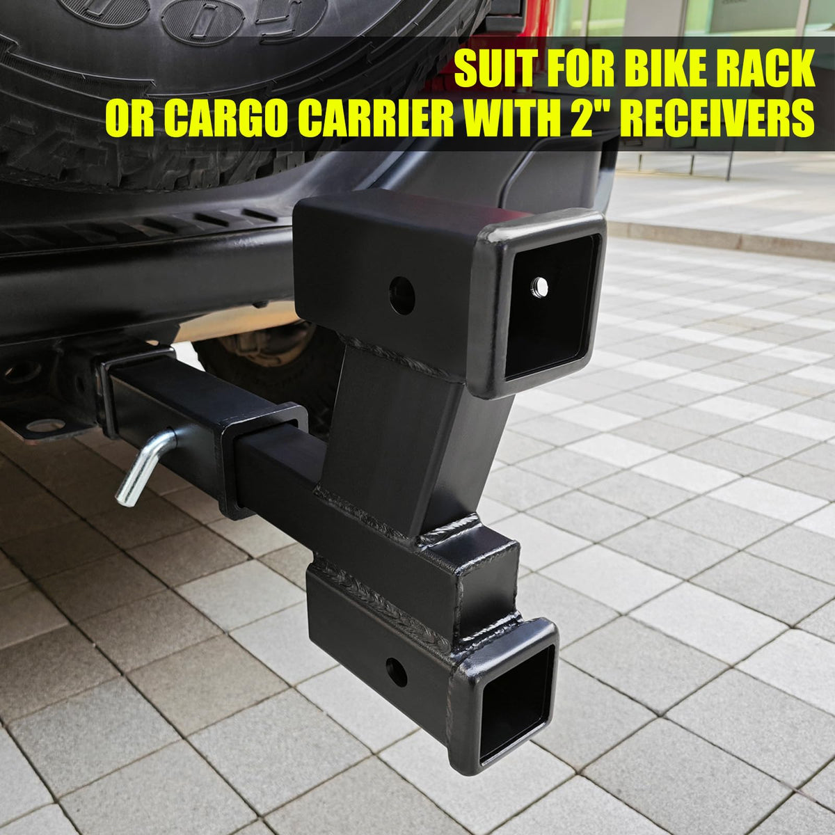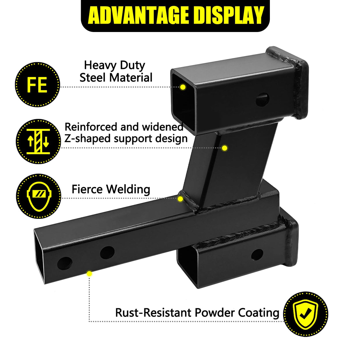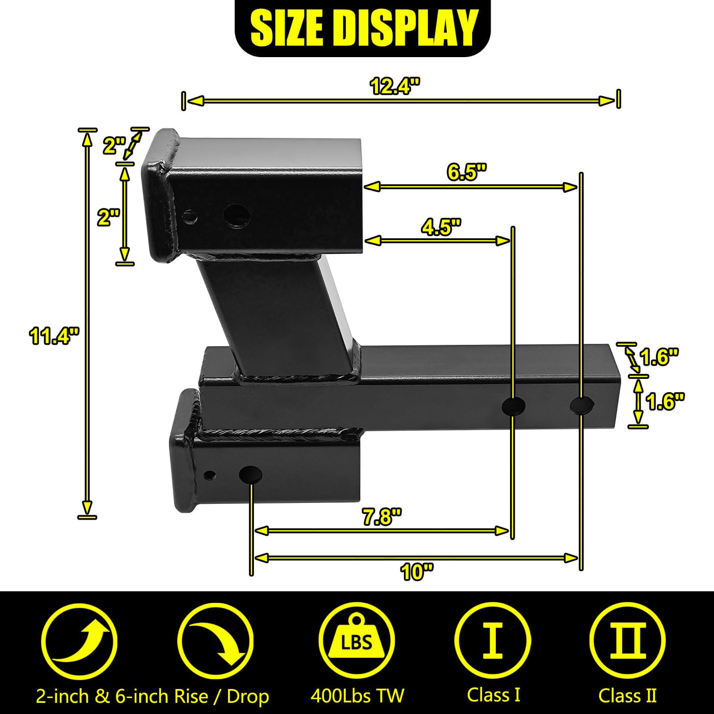 Please check the product dimension (i.e. drop, rise, extender length, shank size, receiver size, etc.) before purchase. ?RECEIVER SIZE: This trailer hitch extension riser has 2-Inch by 2-Inch industry-standard receiver, fits for most 2-Inch shank of ball mounts, bike racks, cargo carriers and other hitch accessories. HITCH RISER OR DROP: 2 inch and 6 inch drop or rise can be turned up or down to level the towing system ADJUSTABLE LENGTH: 2 pin holes design makes this adjustable trailer hitch have 2 active length (8'' & 10'' hole to hole length) and avoid interfere with the vehicle bumper CAPACITY: Total Gross Towing Weight: 10,000 lbs. Total Tongue Weight: 400 lbs. Fits for most of 2'' Towing Receiver Hitches.Heavy duty for towing trailer, boat, camper, bike rack, cargo carrier, etc. RECEIVER SIZE: 2-inch by 2-inch. With anti-rattle bolt device ?CORROSION RESISTANT: Made of high grade steel with a durable satin black powder coat finish, super corrosion resistant