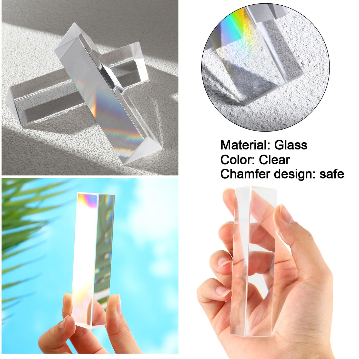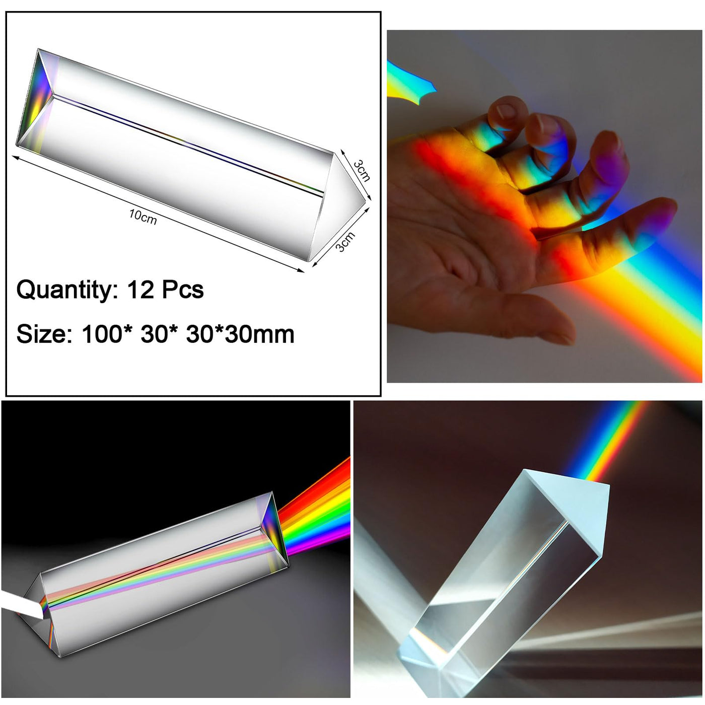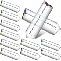 Features: Crystal prisms with safe rounded edges are ideal for teaching kids about the nature of light and how to create rainbows, making learning easy and fun. 4 Inch triangular prism is an ideal science experiment and classroom learning supplies, shooting props, party gifts, etc., to meet the needs of learning and playing. Specifications: Material: crystal glass Color: clear Size: about 4 inch Package includes: 12 x Optical glass triangular prism Notes: Manual measurement, please allow slight errors on size. The color may exist a slight difference due to different screen displays.