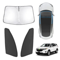 Karltys Windshield Sunscreen for Chevy Equinox--Helps with Heat & UV Reduction to Your Car. --Fit perfectly for Chevrolet Chevy Equinox 2018 2019 2020 2021 2022 2023 2024, no gap. --Quality 210T reflective and high density fabric, works really well to keep the sun and harmful UV rays away. --Cover the entire windshield, no worries regarding fading or cracking of the interior. --Do a better job in blocking out the direct sunlight and UV rays, and make your car stay cool in sunny days. --Excellent protection for privacy to take a nap or temporary parking. --Install and remove in seconds. Folding is a snap too. -- Come with a nice pouch to keep the shades from being damaged when not being used. Package Includes: 1PC Windshield Blocker 2PCS Front Seat Side Window Covers