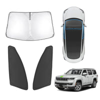 Product Description: --Karltys Car Windshield Sunshade--Helps with Heat & UV Reduction to Your Car. --Fit perfectly for Jeep Grand Wagoneer 2022 2023 2024 2025, no gap. --Quality 210T reflective and high density fabric, works really well to keep the sun and harmful UV rays away. --Cover the entire windshield, no worries regarding fading or cracking of the interior. --Do a better job in blocking out the direct sunlight and UV rays, and make your car stay cool in sunny days. --Excellent protection for privacy to take a nap or temporary parking. --Install and remove in seconds. Folding is a snap too. -- Come with a nice pouch to keep the shades from being damaged when not being used. Package Includes: 1PC Windshield Shade 2PCS Front Seat Side Window Covers