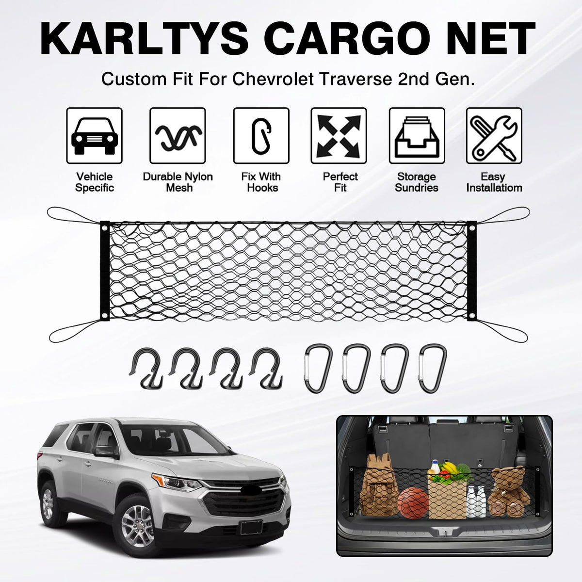 Karltys Envelope Cargo Net--A Must Have for Chevy Traverse Owners. Vehicle Specific: Only designed for Chevy /Cheverolet Traverse 2018-2024 2025. Please check your vehicle and its model year before purchase. Why Choose Karltys Trunk Cargo Net? Original car specifications, custom fit to your cargo area. Envelope style, elastic and stretchy, can accommodate a wide variety of shapes and sizes. Vertical design helps keep items contained while opening and closing the hatch. Premium nylon mesh netting, odorless, durable and stain-resistant. Perfect for keeping items from rolling around or getting damaged. Quick and easy installation. No tools or trimming required. Easy to remove and store when not in use. Package Includes: 1* Envelope Style Cargo Net 4* Metal Hooks 4* Plastic Hooks