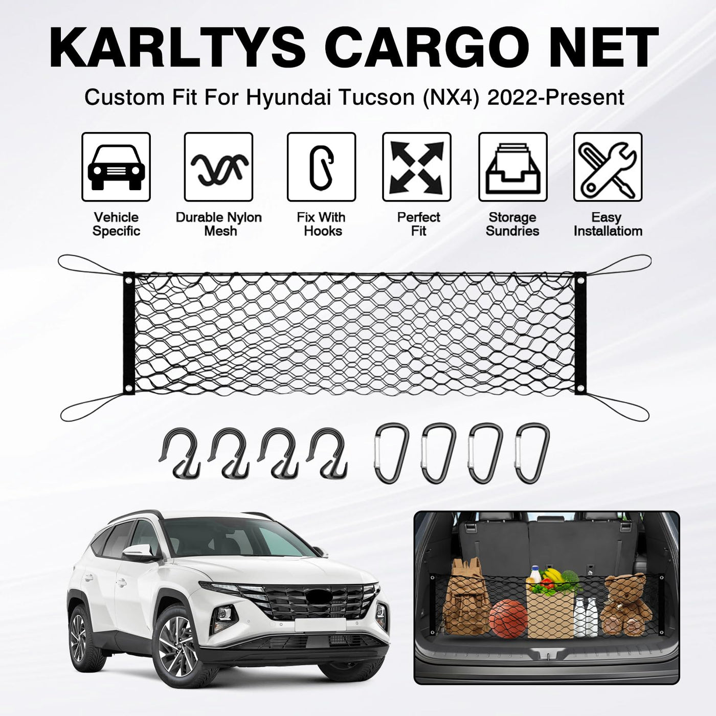 Product Description: Karltys Envelope Cargo Net--A Must Have for Hyundai Tucson Owners. Vehicle Specific: Only designed for Hyundai Tucson 2022 2023 2024 2025. Please check your vehicle and its model year before purchase. Why Choose Karltys Trunk Cargo Net? Original car specifications, custom fit to your cargo area. Envelope style, elastic and stretchy, can accommodate a wide variety of shapes and sizes. Vertical design helps keep items contained while opening and closing the hatch. Premium nylon mesh netting, odorless, durable and stain-resistant. Perfect for keeping items from rolling around or getting damaged. Quick and easy installation. No tools or trimming required. Easy to remove and store when not in use. Package Includes: 1* Envelope Style Cargo Net 4* Metal Hooks 4* Plastic Hooks