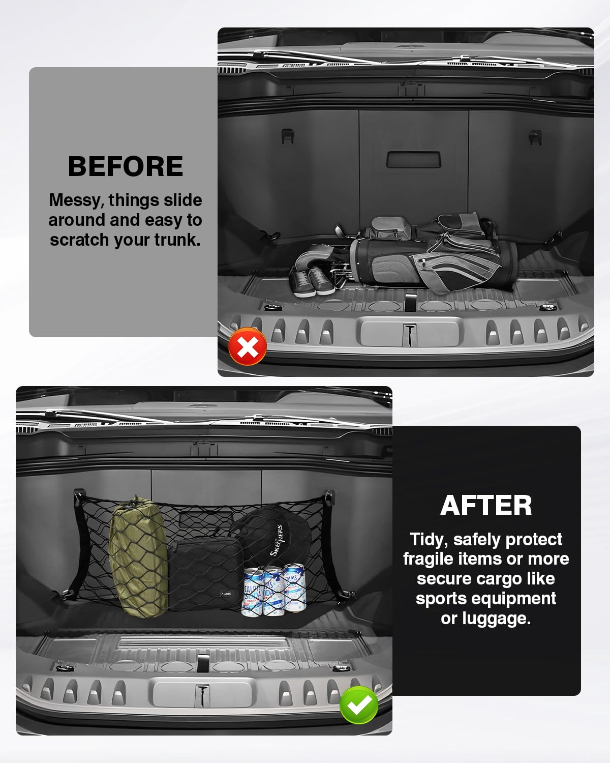 Product Description: Karltys Stand Envelope Cargo Net--A Must Have for Any F150 Lightning Owner. Vehicle Specific: Only designed for F-150 Lightning 2022 2023 2024 2025. Please check your vehicle and its model year before purchase. Why Choose Karltys Trunk Cargo Net? Original car specifications, custom fit to your cargo area. Envelope style, elastic and stretchy, can accommodate a wide variety of shapes and sizes. Vertical design helps keep items contained while opening and closing the hatch. Premium nylon mesh netting, odorless, durable and stain-resistant. Perfect for keeping items from rolling around or getting damaged. Quick and easy installation. No tools or trimming required. Easy to remove and store when not in use.