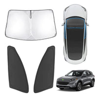 Karltys Windshield Sunscreen--Helps with Heat & UV Reduction to Your car --Fit perfectly for Ford Escape 2020 2021 2022 2023, no gap --Quality 210T reflective and high density fabric, works really well to keep the sun and harmful UV rays away --cover the entire windshield, no worries regarding fading or cracking of the interior --Do a better job in blocking out the direct sunlight and UV rays, and make your car stay cool in sunny days --Excellent protection for privacy to take a nap or temporary parking --Install and remove in seconds Folding is a snap too -- come with a nice pouch to keep the shades from being damaged when not being used Package Includes: 1Pc Windshield Blocker 2PcS Front Seat Side Window covers