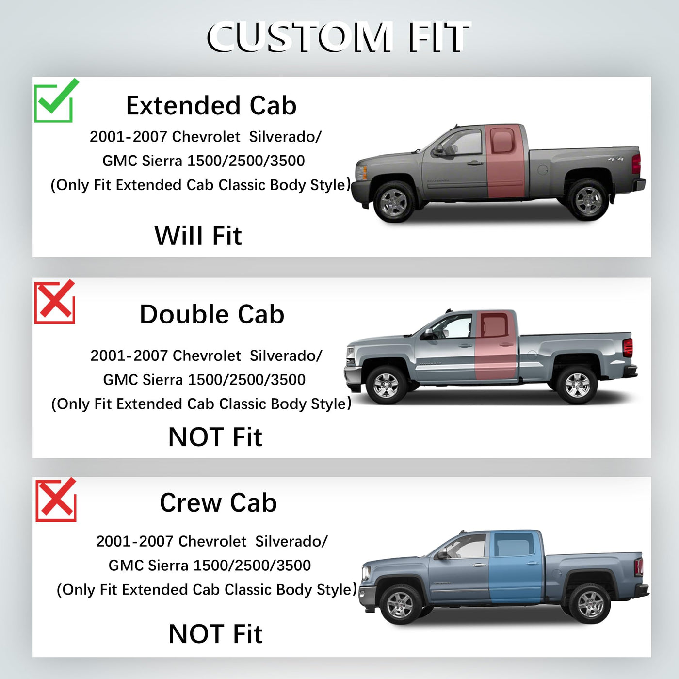 Q: Are these floor mats compatible with my 2001-2007 Chevrolet Silverado or GMC Sierra?A: Yes, these KARPAL floor mats are specifically designed to fit 2001-2007 Chevrolet Silverado and GMC Sierra models, particularly for the Extended Cab Classic Body Style.