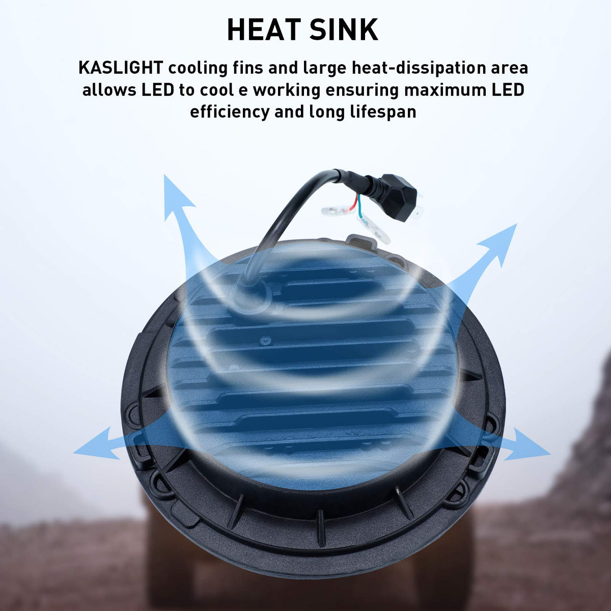 Q: What are the key features of the KASLIGHT 7 Inch Round LED Headlights?A: Key features of the KASLIGHT 7 Inch Round LED Headlights include a durable aluminum base housing, anti-scratch polycarbonate lens, a waterproof rating of IP67, and a lifetime of up to 50,000 hours. Additionally, they come with a white halo ring for daytime running lights and yellow amber turn signal lights, enhancing safety and visibility.