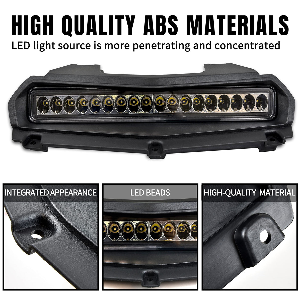Q: What materials are used in the construction of the KATIMOTO LED Hood Scoop Light?A: The KATIMOTO LED Hood Scoop Light is made from high-quality Acrylonitrile Butadiene Styrene (ABS), which is durable, resistant to friction, impact, and corrosion, ensuring longevity and performance.