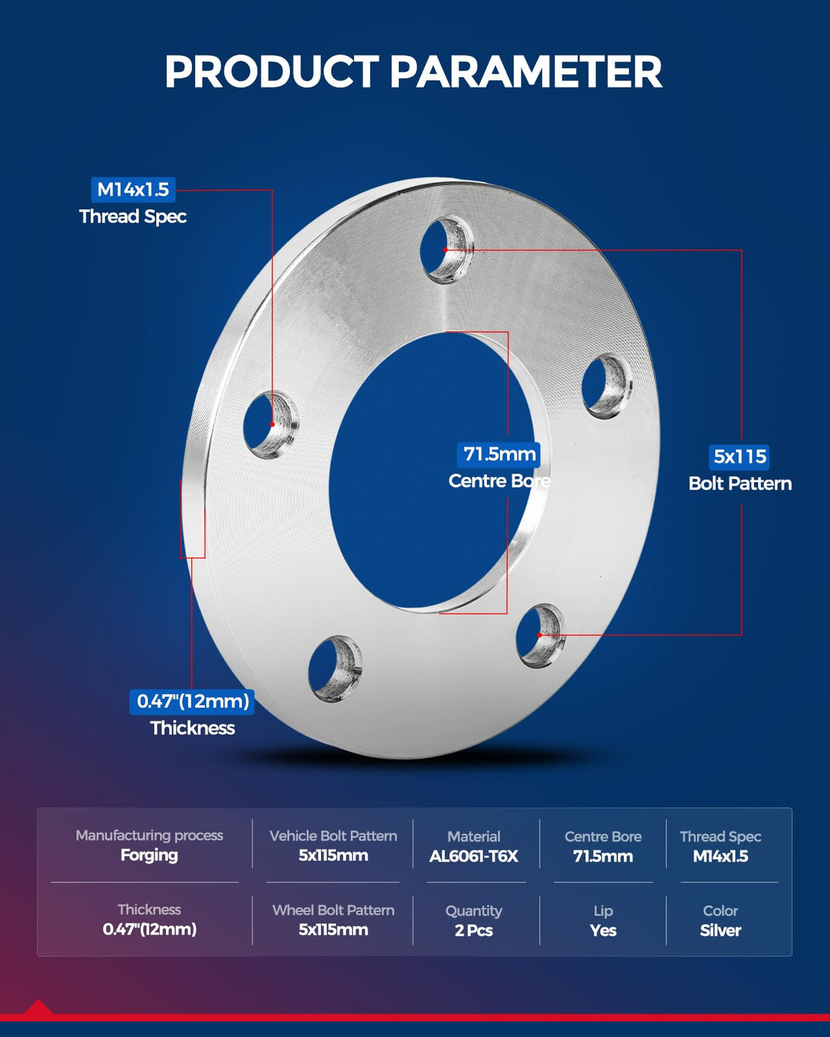 ?KAX Slip-On Wheel Spacers Parameter : Vehicle & Wheels Bolt Pattern Must Be 5x115mm || 12mm Thick || 71.5mm Center Bore with lip || Package includes 2Pcs wheel spacers,professional instruction manual | ?Compatibility : 5x115 wheel spacers 12mm are compatible with ALL For:; 2011-2023 Charger 3.6L RWD Naturally Aspirated V6; Challenger 3.6/6.4L RWD Naturally Aspirated V6/V8; 2006-2023 Charger 5.7L RWD Naturally Aspirated V8; 2005-2010 300 2.7/3.5/6.1L AWD/RWD Naturally Aspirated V6/V8; 2006-2010 Charger 2.7/3.5/6.1L RWD Naturally Aspirated V6/V8; 2012-2023 Charger 3.6/6.4L AWD/RWD Naturally Aspirated V6/V8; 300 3.6L AWD Naturally Aspirated V6; 2009-2023 Challenger 5.7L RWD Natu | ?Newest Forging Technology : 5x115 hub centric wheel spacers are truly forged from aircraft quality 6061-T6 aluminum. You can imagine how exacting the craft of aircraft manufacture is! So it is with spacer. Regardless of the cold wind and heat, the spacer will not fall off and break | ?Why Install Wheel Spacers : 12mm wheel spacers can widen the vehicles track, fix clearance & offset issues from aftermarket wheels,allow you to travel safely in the outdoors such as mountains and wilderness | ?Warm Reminder : Even if a vehicle is listed as being compatible, buyers still need to check: 1) You have more than 2 inch of space between your fender and your wheel/tire; 2) Your factory wheel studs are shorter than 2 inch (NOTE: * When installing a bolt on wheel spacer or adapter, trimming the studs will be necessary when the spacer or adapter plate is thinner than your wheel studs are long.)