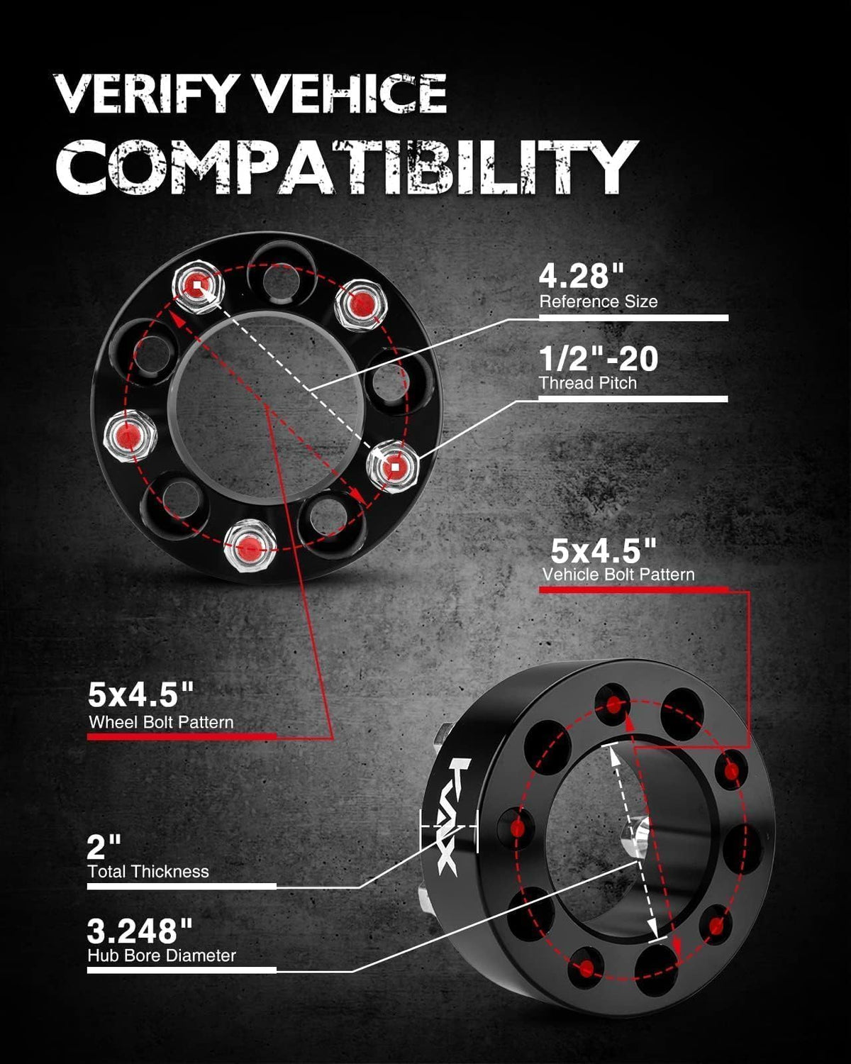 ?KAX Bolt On Wheel Spacers Parameter : Vehicle & Wheels Bolt Pattern Must Be 5x4.5''(5x114.3mm) || 2 inch(50.8mm) Thick || 1/2''x20 Threaded Studs/Nuts || 82.5mm Center Bore with NO lip || Recommended torque: 75-85 ft/lbs. Package includes 2Pcs wheel spacers, 10.9 class split nuts and professional instruction manual | ?Compatibility : 5x4.5 wheel spacers 2 inch are compatible with 1998-2011 Ranger; 1998-2009 Mazda B4000; 1995-2005 Explorer; 1993-1998 Jeep Grand Cherokee; 2001-2005 Explorer Sport Trac; 1989-1993 Jeep Cherokee; 1998-2002 Mazda B3000; 1997-2001 Mercury Mountaineer; 2007-2010 Edge; Lincoln MKX; 2001-2003 Explorer Sport; 1990-1992 Jeep Comanche | ?Newest Forging Technology : 5x4.5 lug centric wheel spacers are truly forged from aircraft quality 6061-T6 aluminum. You can imagine how exacting the craft of aircraft manufacture is! So it is with spacer. Coupled with SGS certified 10.9 grades high strength bolts, regardless of the cold wind and heat, the adapter will not fall off and break | ?Why Install Wheel Spacers : 2 inch wheel spacers can widen the vehicles track, fix clearance & offset issues from aftermarket wheels,allow you to travel safely in the outdoors such as mountains and wilderness | ?Warm Reminder : Even if a vehicle is listed as being compatible, buyers still need to check: 1) You have more than 2 inch of space between your fender and your wheel/tire; 2) Your factory wheel studs are shorter than 2 inch (NOTE: * When installing a bolt on wheel spacer or adapter, trimming the studs will be necessary when the spacer or adapter plate is thinner than your wheel studs are long.)