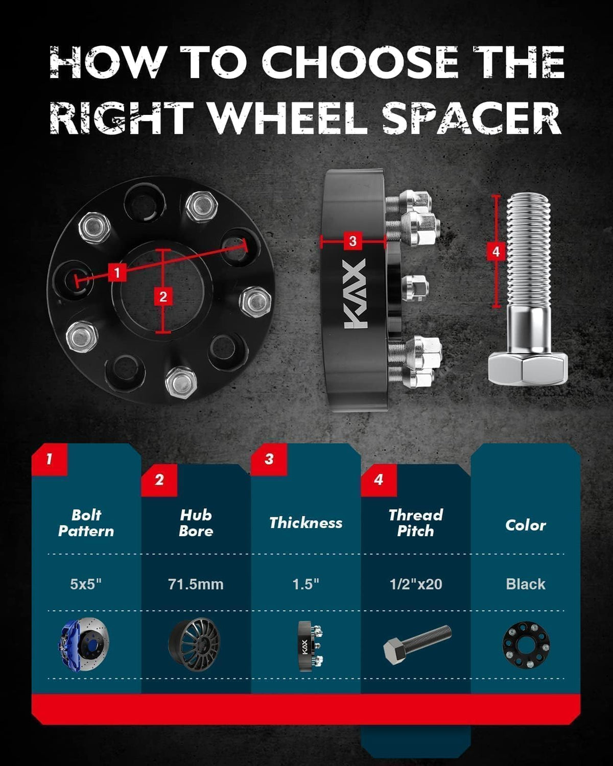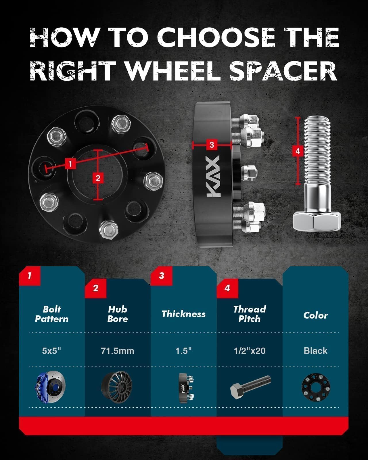 ?KAX Bolt On Wheel Spacers Parameter : Vehicle & Wheels Bolt Pattern Must Be 5x5''(5x127mm) || 1.5 inch(38mm) Thick || 1/2''x20 Threaded Studs/Nuts || 71.5mm Center Bore with lip || Recommended torque: 75-85 ft/lbs. Package includes 4pcs wheel spacers, 10.9 class split nuts and professional instruction manual | ?Fitment : 5x5 wheel spacers 1.5 inch are compatible with 2012-2017 Wrangler 3.6L Naturally Aspirated GAS V6; 2007-2011 Wrangler 3.8L Naturally Aspirated GAS V6; 2005-2010 Grand Cherokee 3.7/5.7L Naturally Aspirated GAS V6/V8; 1999-2004 Grand Cherokee 4.0L Naturally Aspirated GAS L6; 1999-2009 Grand Cherokee 4.7L Naturally Aspirated GAS V8; 2006-2010 Commander 3.7/4.7/5.7L Naturally Aspirated GAS V6/V8; Grand Cherokee 6.1L Naturally Aspirated GAS V8 | ?Newest Forging Technology : 5x5 hub centric wheel spacers are truly forged from aircraft quality 6061-T6 aluminum. You can imagine how exacting the craft of aircraft manufacture is! So it is with spacer. Coupled with SGS certified 10.9 grades high strength bolts, regardless of the cold wind and heat, the adapter will not fall off and break | ?Why Install 5 Lug Wheel Spacers : 1.5 inch wheel spacers 5x127 can widen the vehicles track, fix clearance & offset issues from aftermarket wheels,allow you to travel safely in the outdoors such as mountains and wilderness.We use wheel spacers to widen the stance on our cars, trucks, & SUVs. | ?Warm Reminder : Even if a vehicle is listed as being compatible, buyers still need to check: 1) You have more than 2 inch of space between your fender and your wheel/tire; 2) Your factory wheel studs are shorter than 2 inch (NOTE: * When installing a bolt on wheel spacer or adapter, trimming the studs will be necessary when the spacer or adapter plate is thinner than your wheel studs are long.)