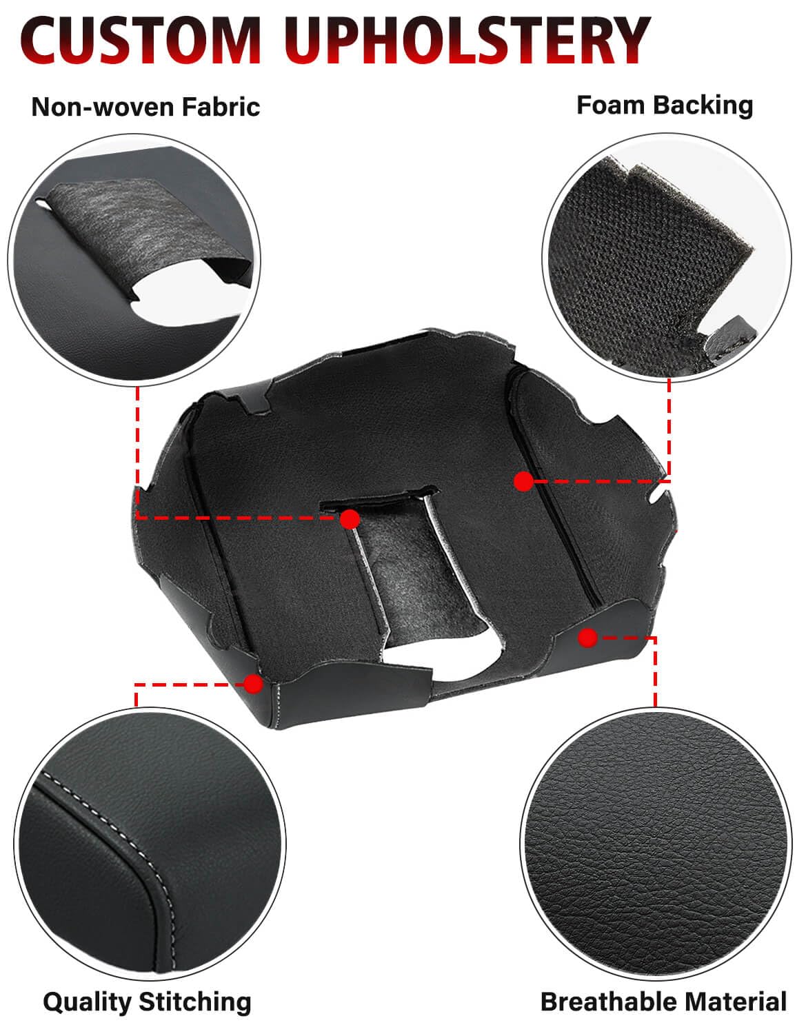 Q: How do I install the armrest cover?A: To install the armrest cover, you need to disassemble the console lid, remove the original upholstery, apply glue to the edges, and then carefully position the new cover, ensuring a snug fit. Detailed installation instructions are included in the product images.