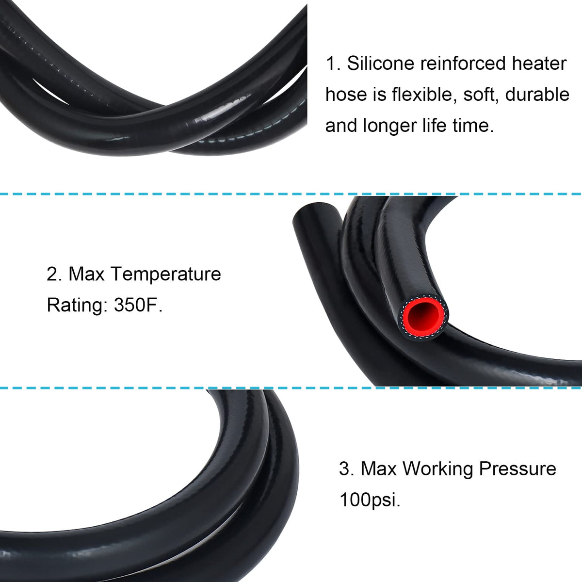 'High Temp Reinforced Silicone Heater Hose 5/8''''ID X 10 Feet per roll(3M),Outer Black Inner Red ID: 16MM WALL:4.5MM OD:25MM Length: 3M/10FT Max Temperature Rating: 350F Max Working Pressure 145psi 2-Ply reinforcement construction for higher pressure resistance. Extreme Temperature Resistance with Superior Flexibility ( -65F / +350F ) More on Temp rating below. Polyster Fiber Reinforced for high pressure & resistant to coolant additives. It applies to general purpose air or water transportation, which can be used as a radiator hose, coolant hose, heater hose. This silicone hose/tube is not for Oil or Fuel. Oil will greatly reduce the lifetime of the silicone tube. Notice normal nylon fitting can not stand the temperature of engin bay for long. Please choose high temperature glass filled nylon fitting to connect this reinforced silicone heater hose.''