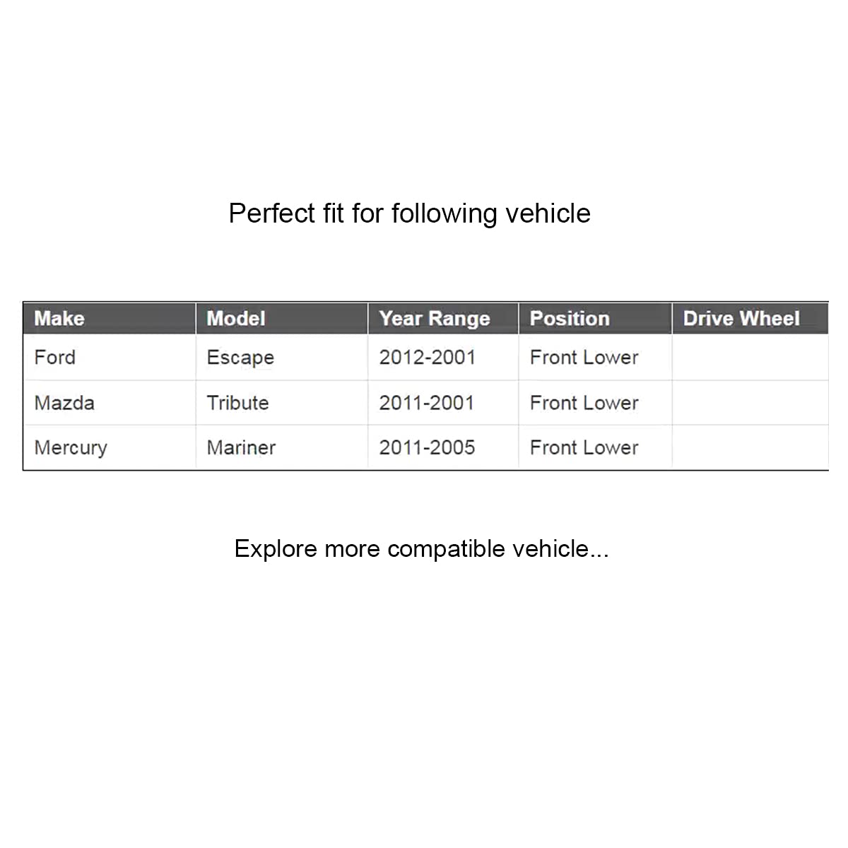Package Includes: 2x Front Lower Ball Joint - K80107 Fitment: Compatible with 2001-2012 Ford Escape Front Lower Compatible with 2001-2011 Mazda Tribute Front Lower Compatible with 2005-2011 Mercury Mariner Front Lower