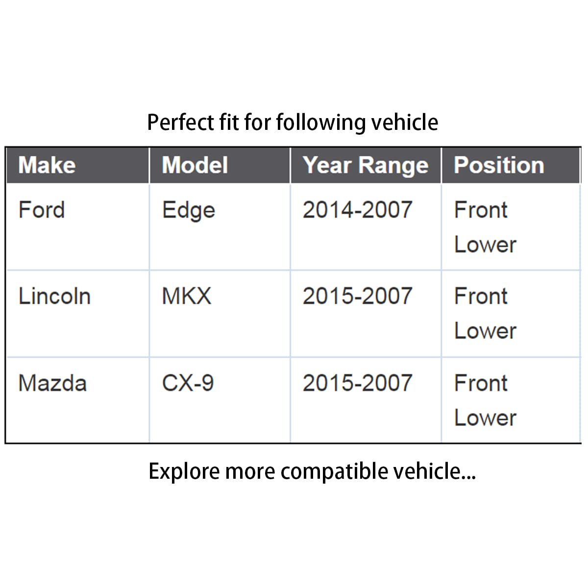 Fitment: Compatible with 2007-2014 Ford Edge Front Lower Compatible with 2007-2015 Lincoln MKX Front Lower Compatible with 2007-2015 Mazda CX-9 Front Lower