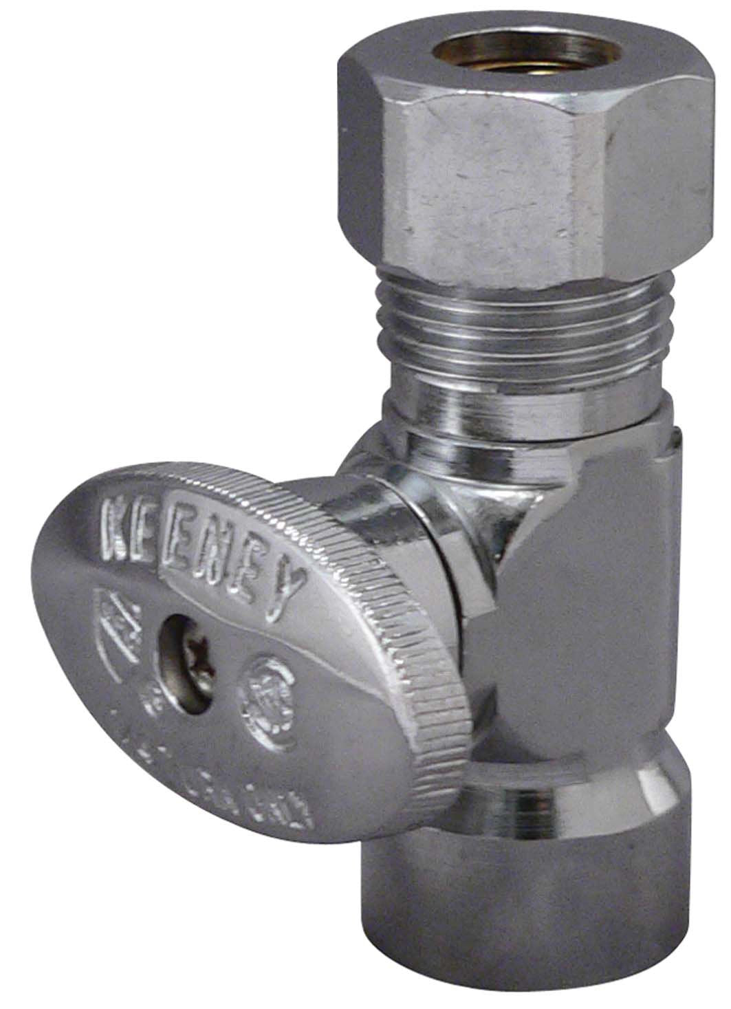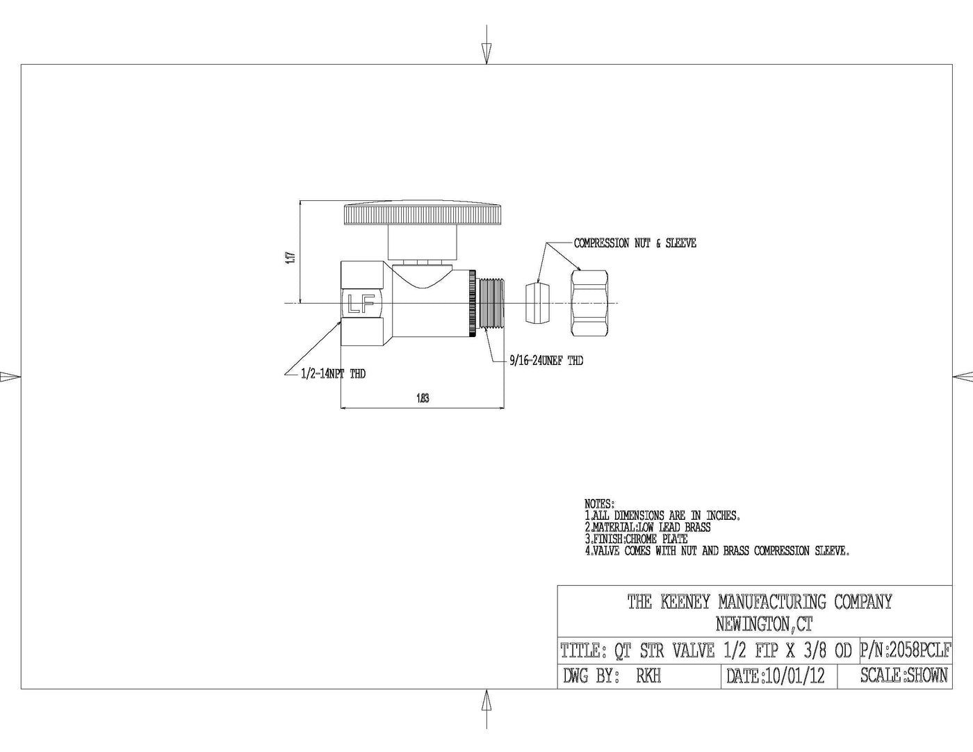 Product DescriptionKeeney 2058PCLF 1/2-Inch FIP by 3/8-Inch O.D. Quarter Turn Straight Valve, ChromeFrom the ManufacturerSolid brass chrome plated quarter turn straight valve. Inlet: 1/2-Inch F.I.P., outlet: 3/8-Inch O.D. Lead Free: This product contains less than 0.25-percent weighted average lead content on wetted surfaces.