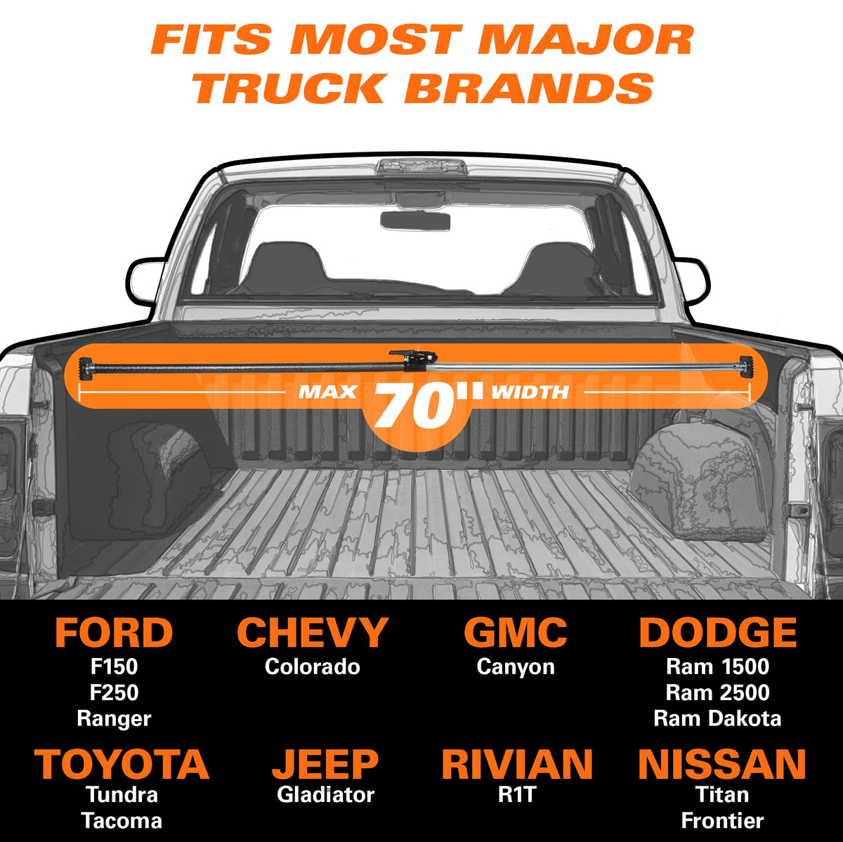 Versatile: Expands From 40 In. To 70 In. Length To Fit Most Cars, Trucks, And Suvs; Please Measure Width Of Vehicle; Will Expand To 70 Inches. Ratchet To The Ideal Of Length Of Your Trunk, Truck Bed, Etc. To Hold In Place On Any Terrain.
