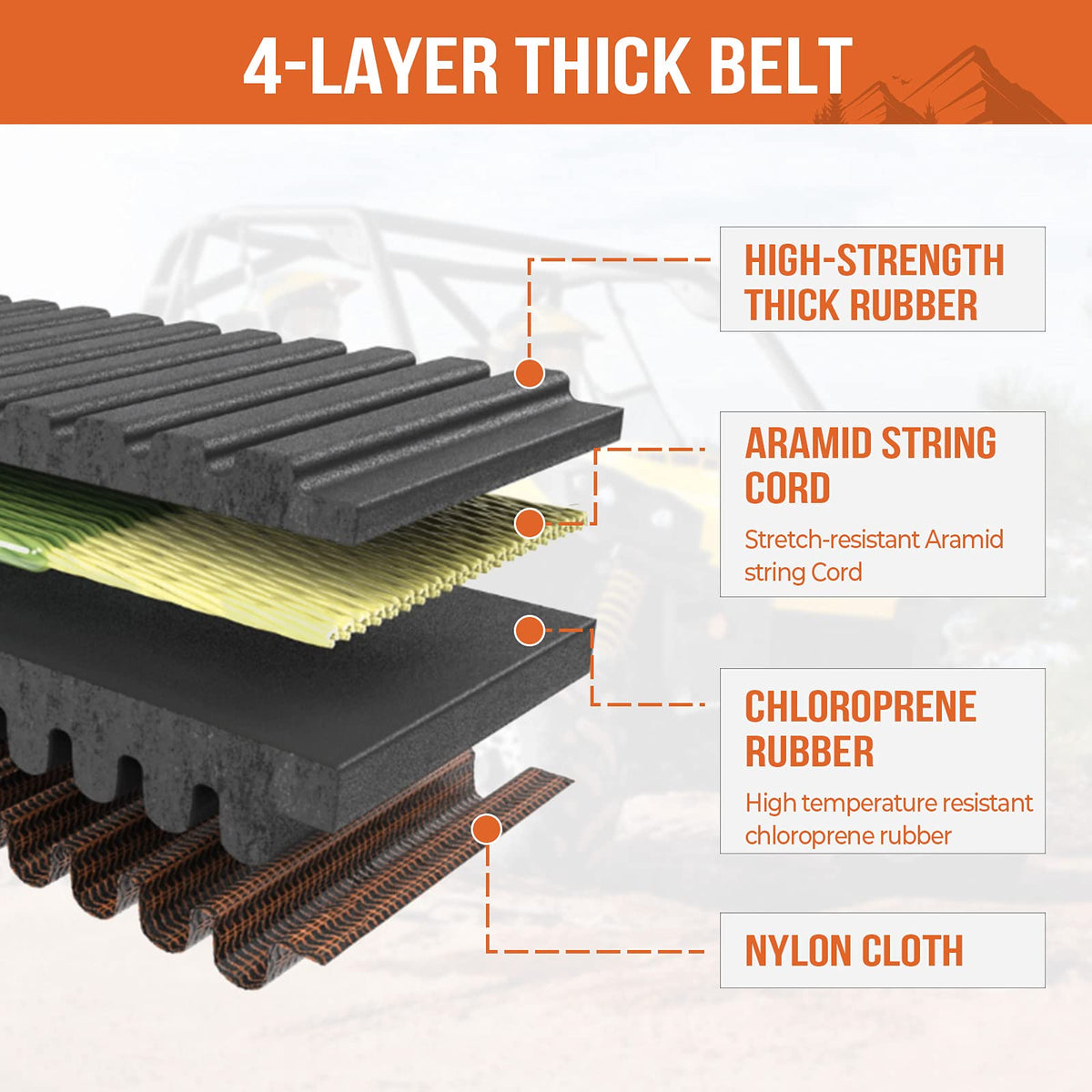 Q: What materials are used in the KEMIMOTO ATV/UTV drive belt?A: The KEMIMOTO drive belt is made from durable Chloroprene rubber reinforced with Aramid string cords for high-temperature resistance. Additionally, a nylon cloth is added to the surface for enhanced durability, making it suitable for rugged conditions.